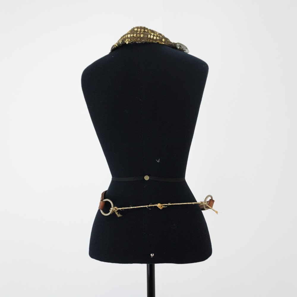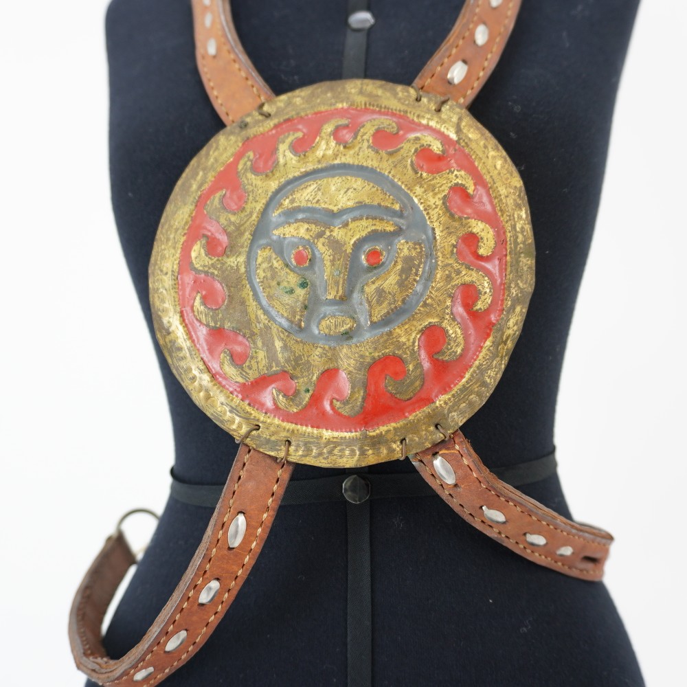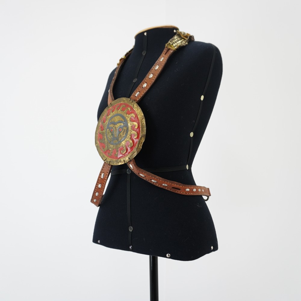 Acessório com medalhão Voltar U.PR.01.097 (1) U.PR.01.097 (2) U.PR.01.097 (3) U.PR.01.097 (4) Metadados Miniatura Compartilhe Número de TomboU.PR.01.097TítuloAcessório com medalhãoDescriçãoAcessório com medalhão de metal redondo dourado e vermelho com desenho de sol. Base de couro marrom com rebites prateados. Aplicação de tecido de paetê fantasia na nuca. Duas alças pendentes com argolas nas extremidades.LocalizaçãoSala 004Quem vestiuDenise AssunçãoDimensões do Item - altura x largura (cm)83 x 17Material/Composição do ItemCouro, tecido e metalEstado de ConservaçãoRegular Continuar navegando Sandália de couro Lampião Vestido de selos Voltar para a lista de itens