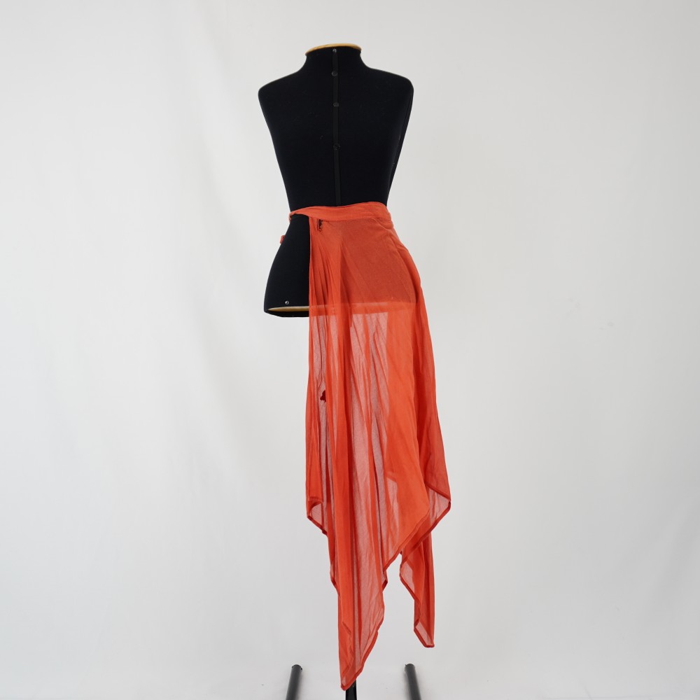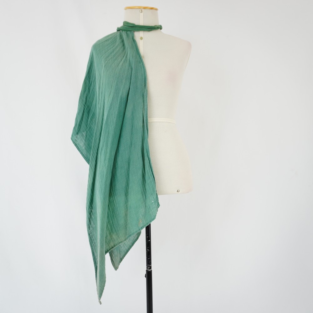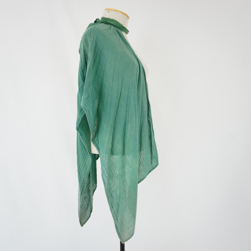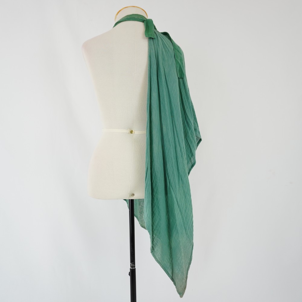 Acessório de figurino retangular verde com amarração no centro de uma das extremidades em outro tecido, mas de mesma cor, possui pregas na região. Estrutura de tela simples com trama mais aberta, amarração em tecido tela com leve transparência