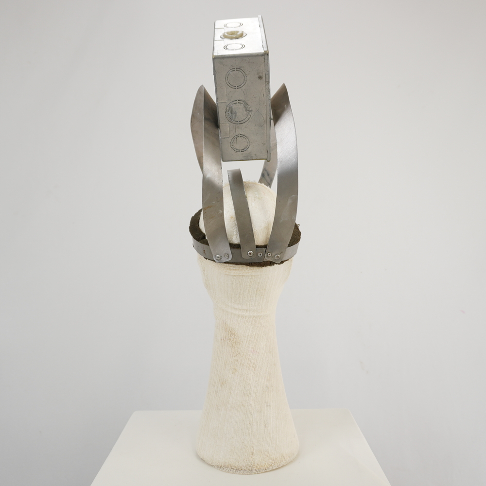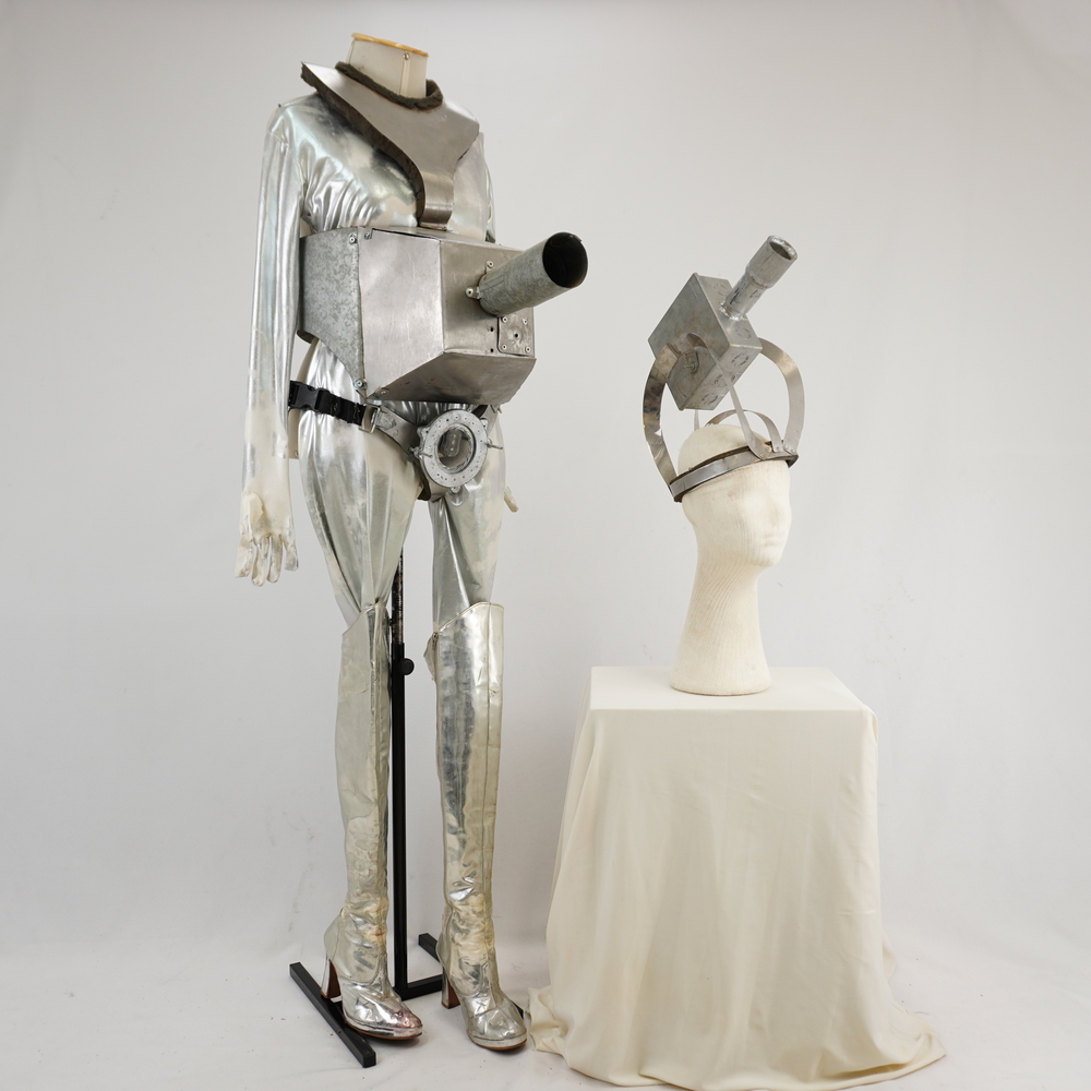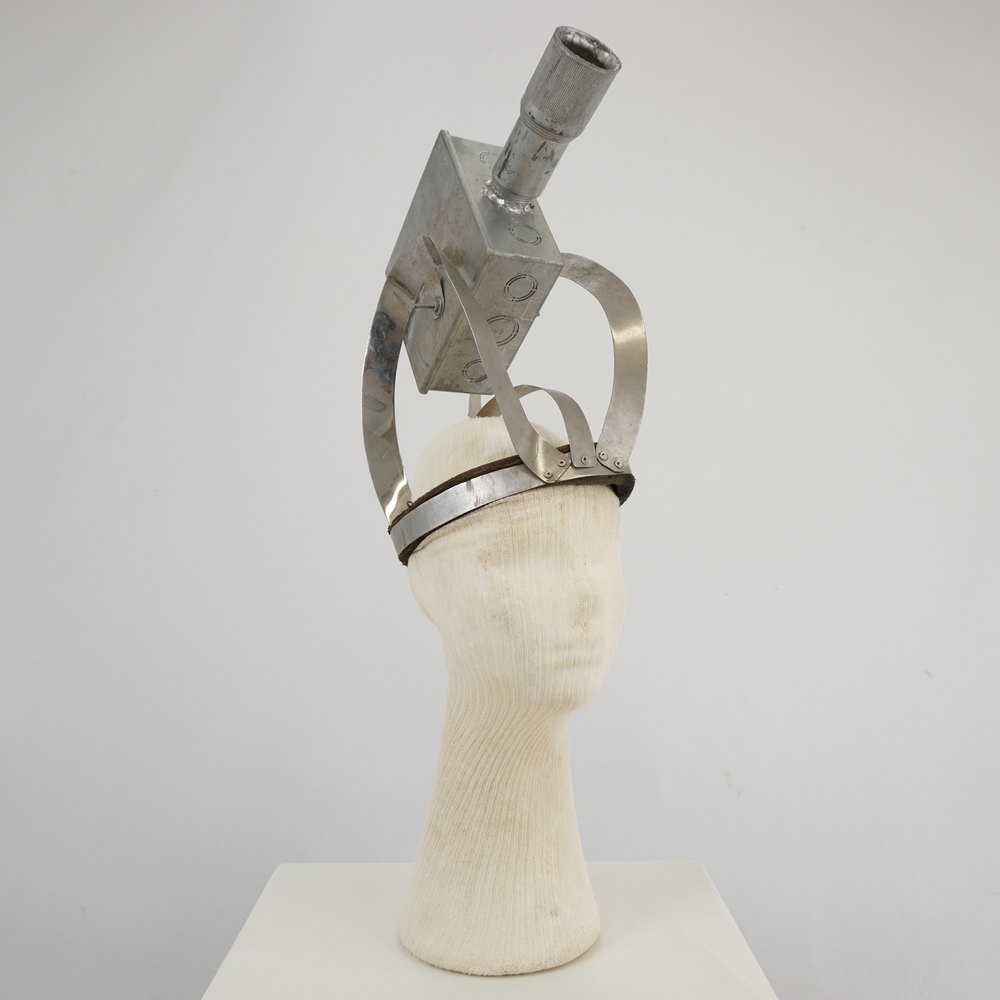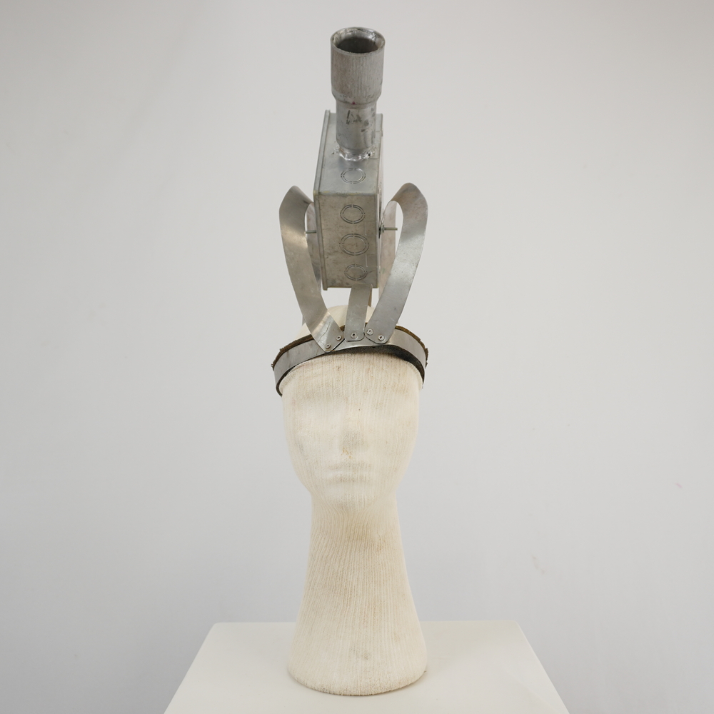 Adereço de cabeça prateado com estrutura de dois aros verticais com câmera acoplada no centro, com possibilidade de ajuste de ângulo, junção com a base da cabeça em rebite e espuma no interior