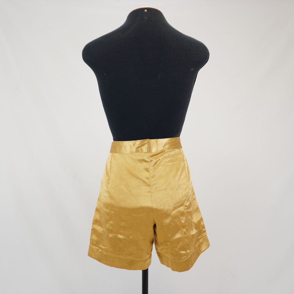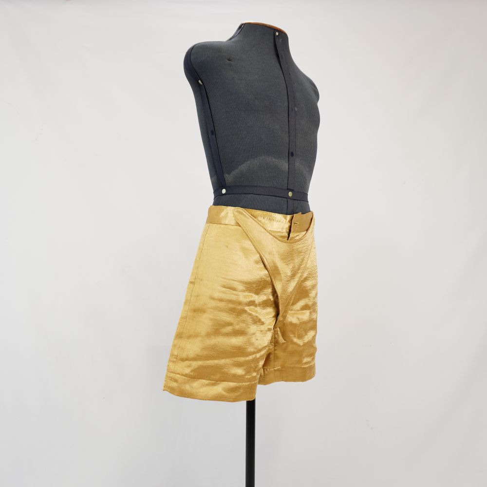 Bermuda dourada curta, em camada dupla sendo interna bege, aplique no mesmo tecido na parte frontal do cavalo até laterais da cintura em formato triangular remetendo à codpiece, fechamento em zíper de metal