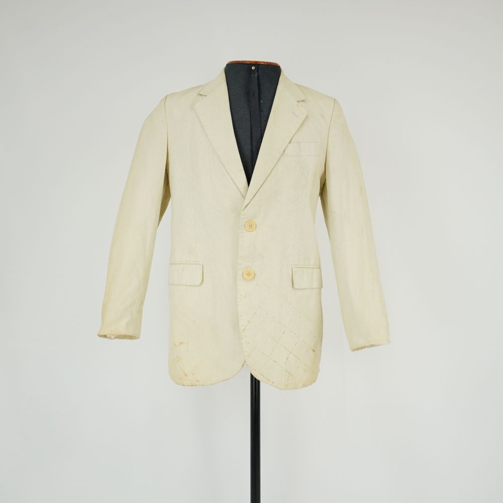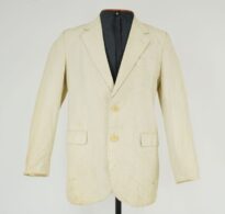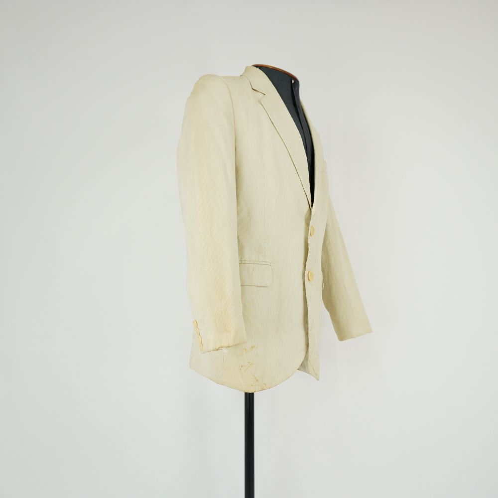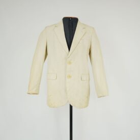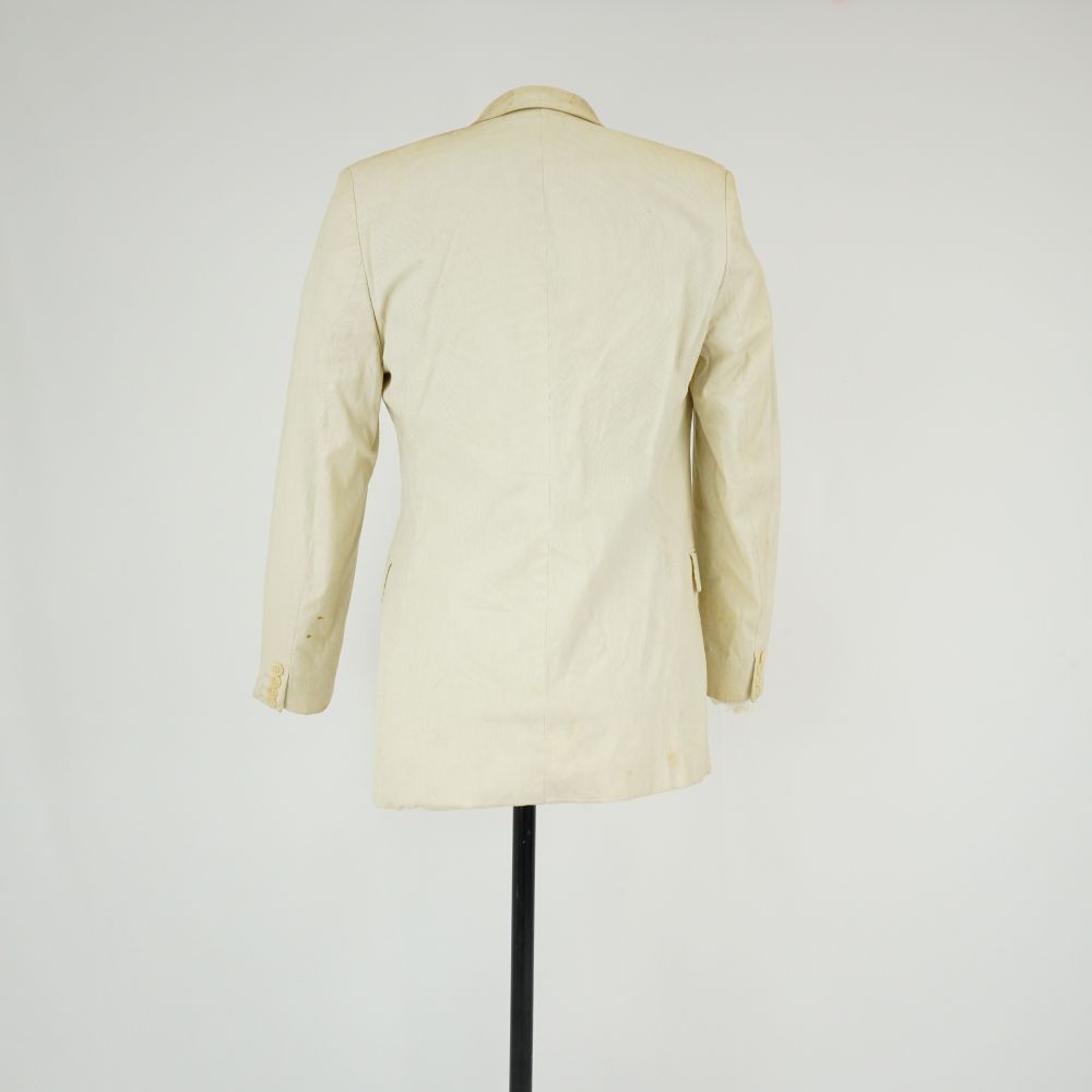 Blazer bege listrado Voltar U.C1.98.044 (1) U.C1.98.044 (2) U.C1.98.044 (3) Metadados Miniatura Compartilhe Número de TomboU.C1.98.044TítuloBlazer bege listradoDescriçãoBlazer bege listrado com três bolsos externos (1 lapela e 2 abas) e três bolsos internos, fechamento em botões de plástico amarelados e quatro botões em cada punho.LocalizaçãoArara 012EspetáculoCacilda!Ano do Espetáculo1998ColeçãoColeção RepertórioDimensões do Item - altura x largura (cm)86 x 75Material/Composição do ItemTecido plano 100% algodão e forro 100% acetato, botões de plásticosEstado de ConservaçãoRegularData da Catalogaçãooutubro 30, 2025 Mais Informações NotasEscrito: "Otavio" "Lady" Continuar navegando Blazer bege listrado Cacilda! Blusa regata azul Cacilda! Voltar para a lista de itens