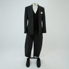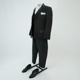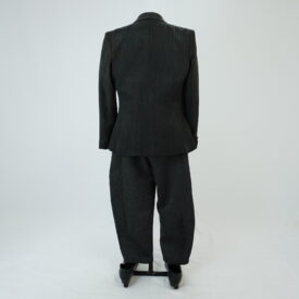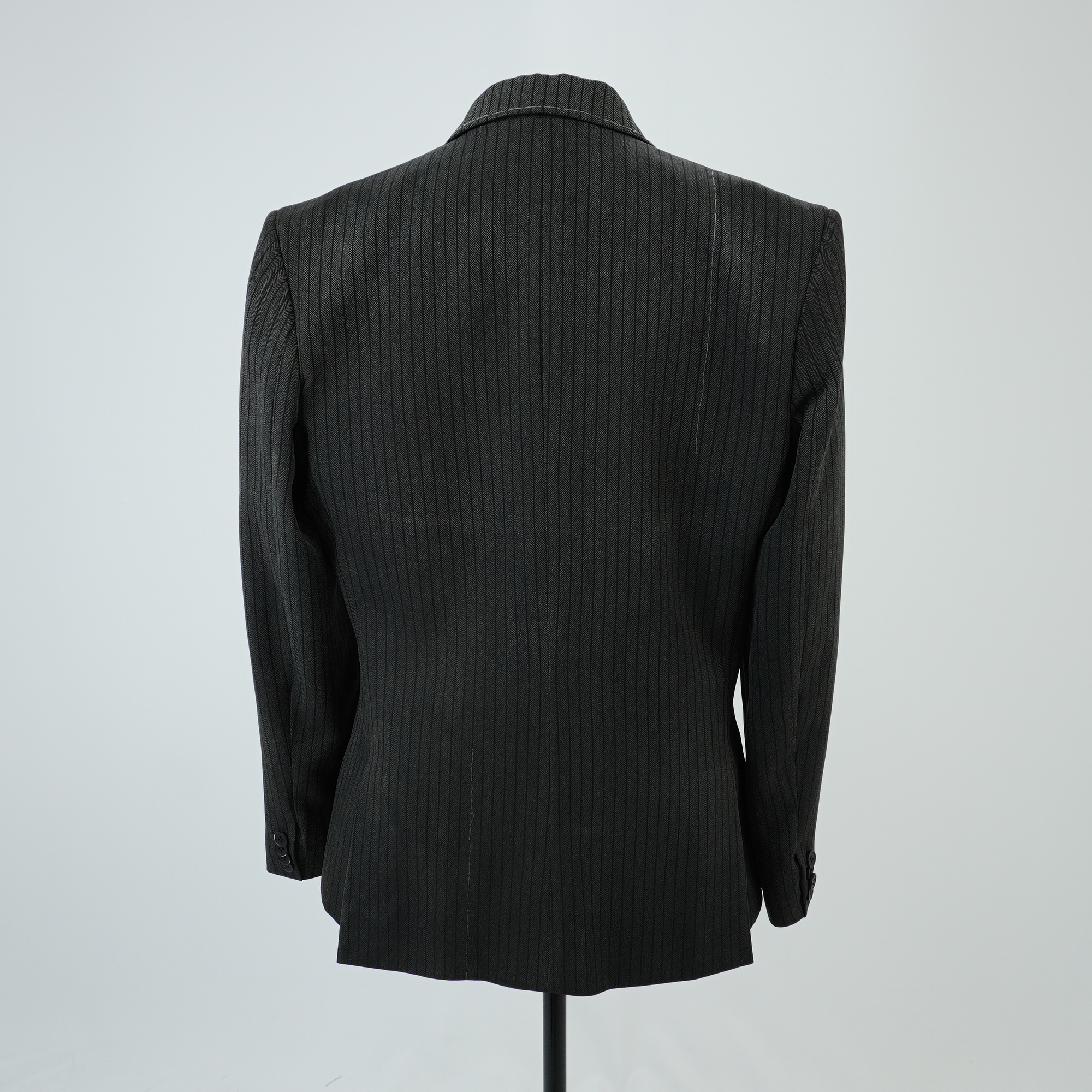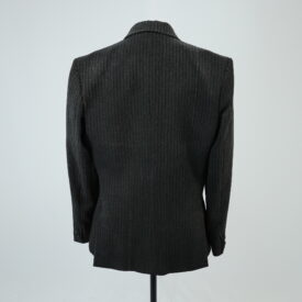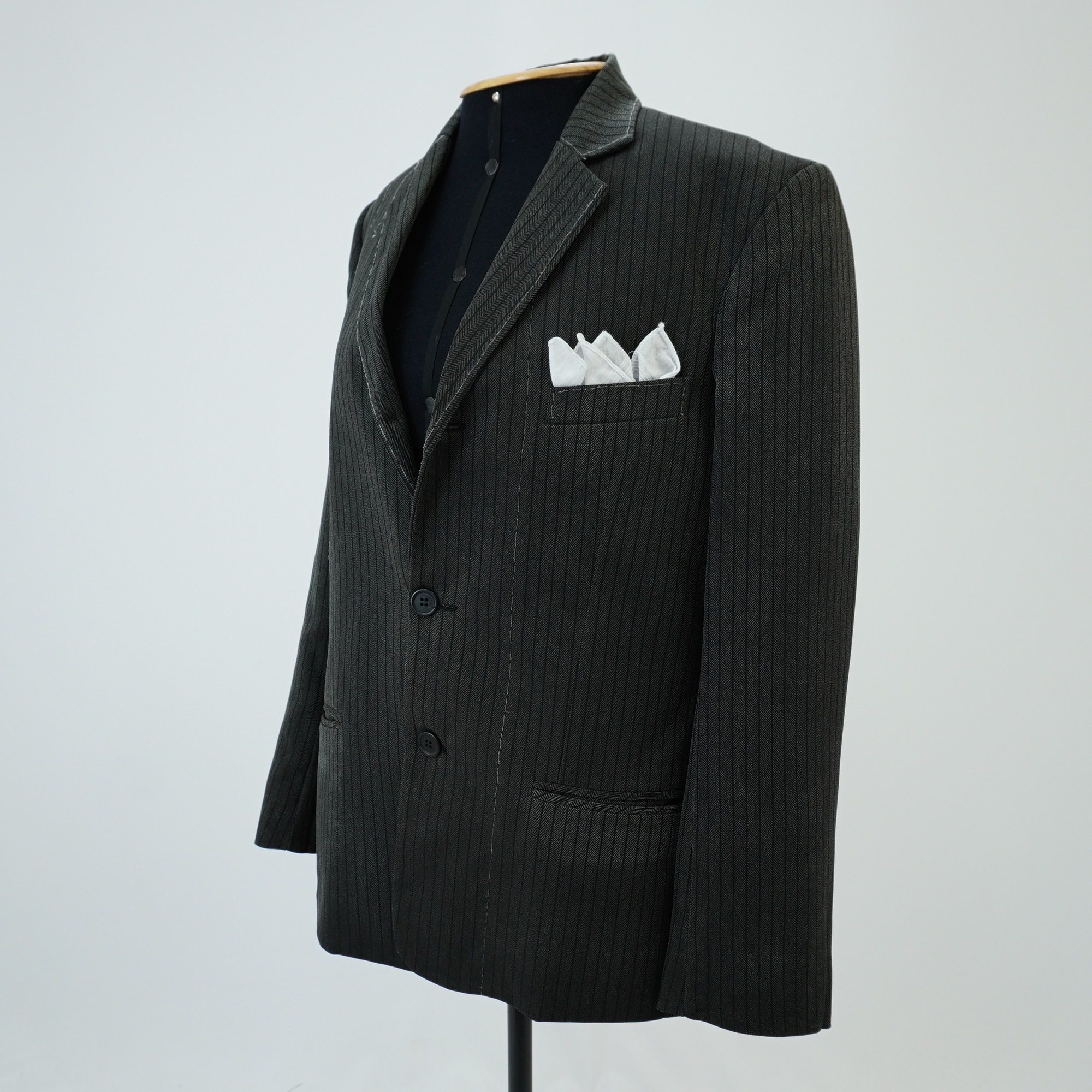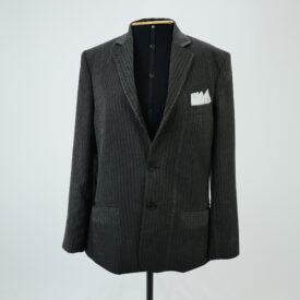 Blazer de terno cinza de risca de giz, corte de alfaiataria contemporâneo, três bolsos embutidos frontais, lenço branco no bolso superior frontal, aplique de malha na axila, um bolso interno e detalhe no corpo de linha de desponto costurado a mão.