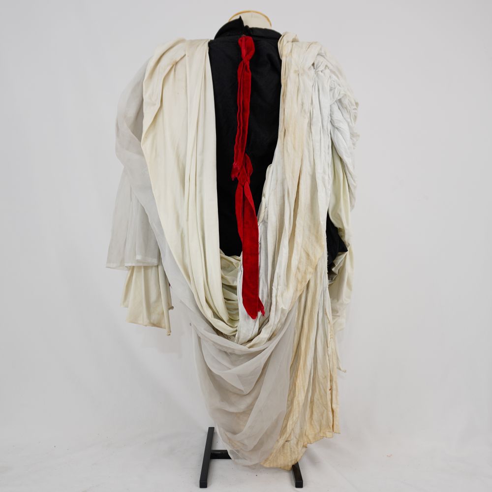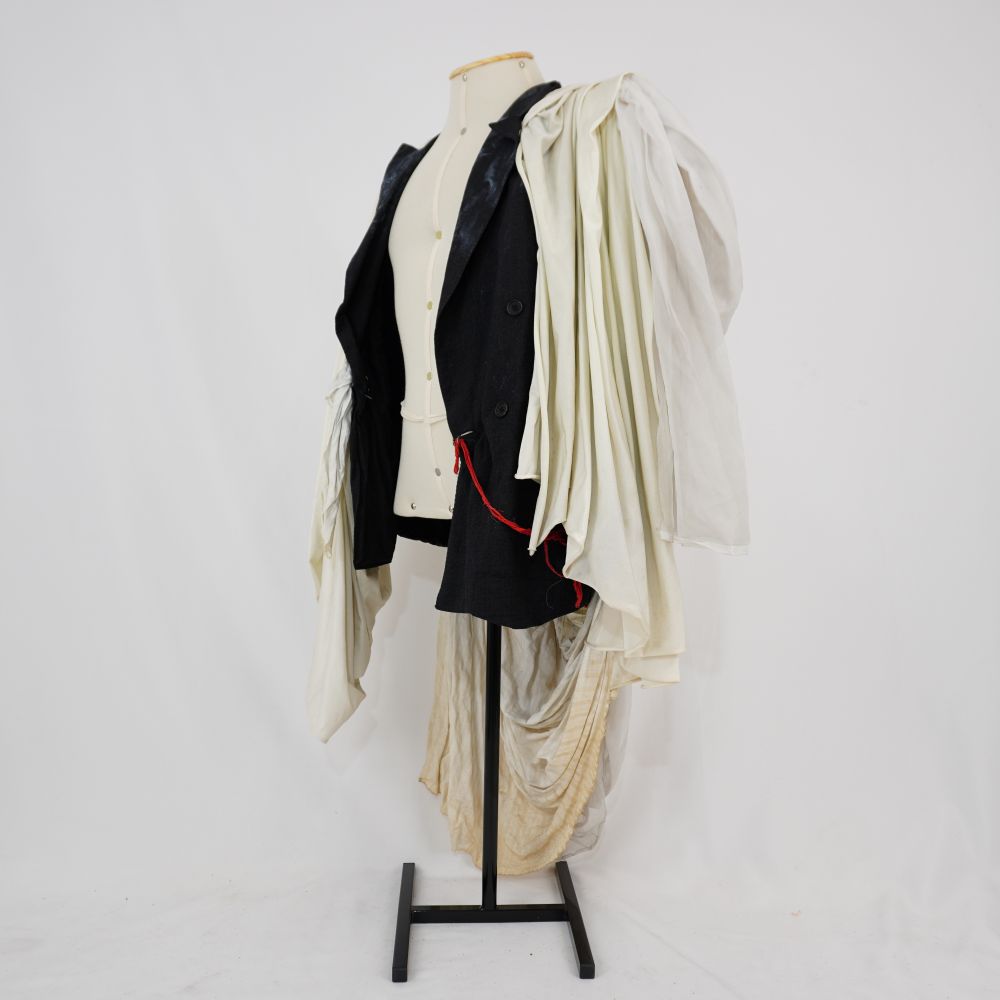 Blazer preto com vista dupla em botões de plástico, três bolsos externos, corda de tecido vermelha na lateral esquerda, quatro fitas de velcro vermelha no meio das costas, tecidos aplicados ao redor do ombro, frente do Blazer Musseline, Tricoline maquineto e malha em tons branco/off white.