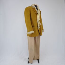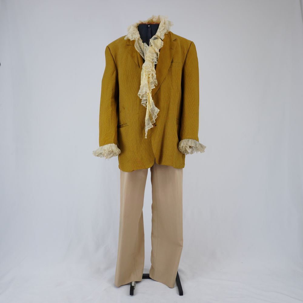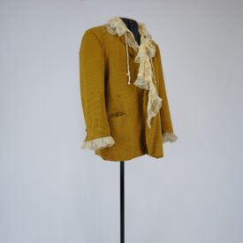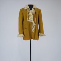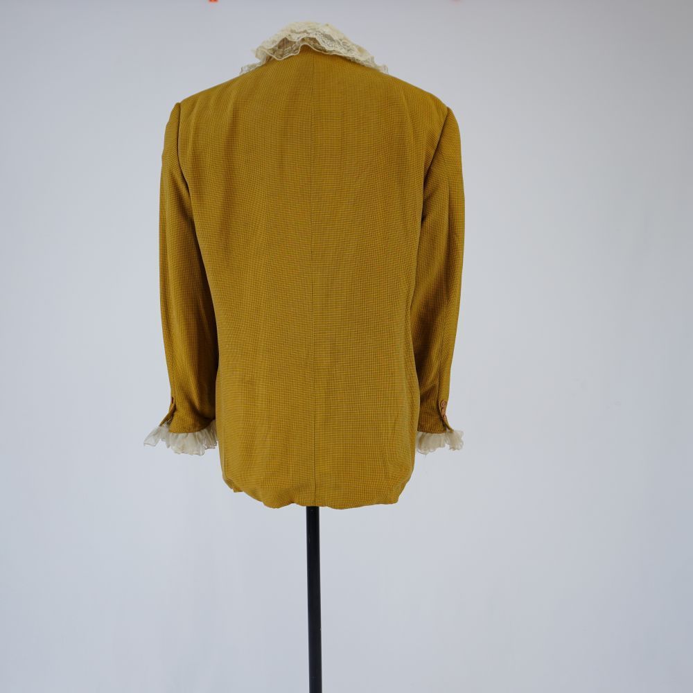 Blazer quadriculado azul e mostarda, três bolsos externos e dois bolsos internos, fechamento na vista e no punho com botões de plástico, babados aplicados no punho, com forro esverdeado. Parte frontal de um colete em jacquard listrado aplicado na parte interna do blazer, botões de plástico decorativos e fechamento com velcro. Aplicação de musseline plissado com renda, tule de malha de corações e cadarço creme com fios dourados.