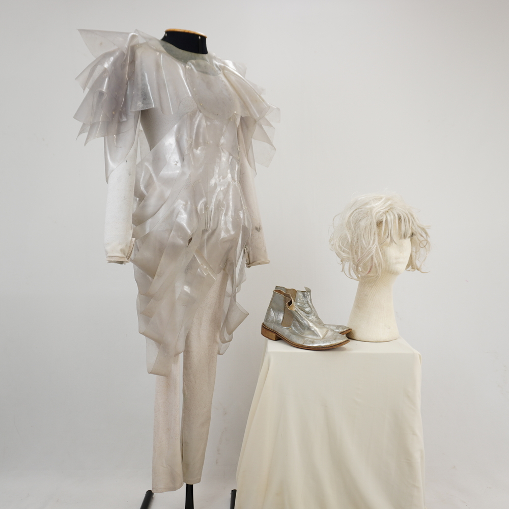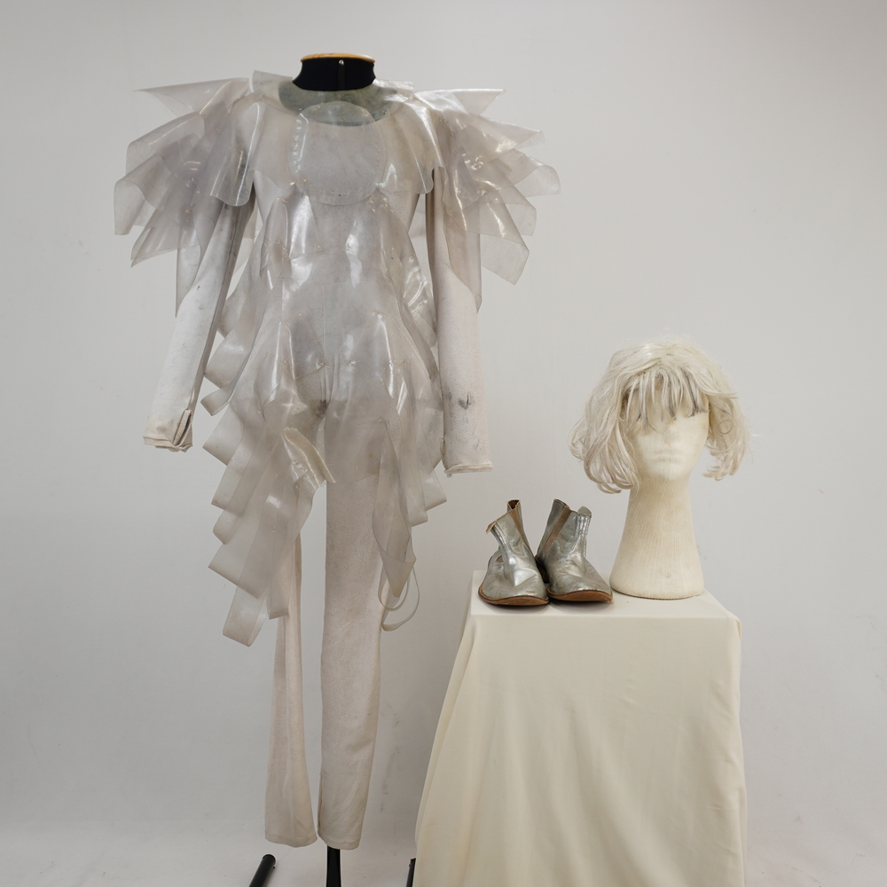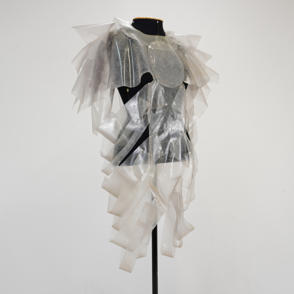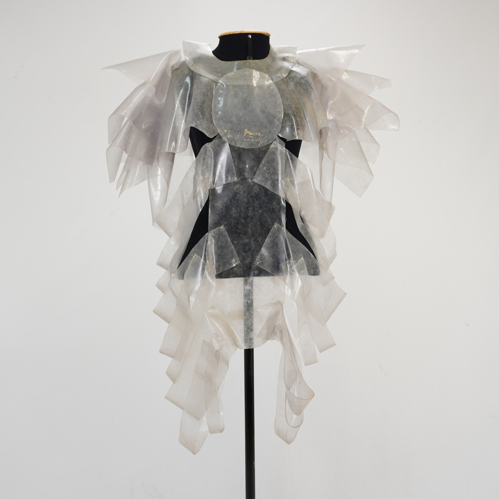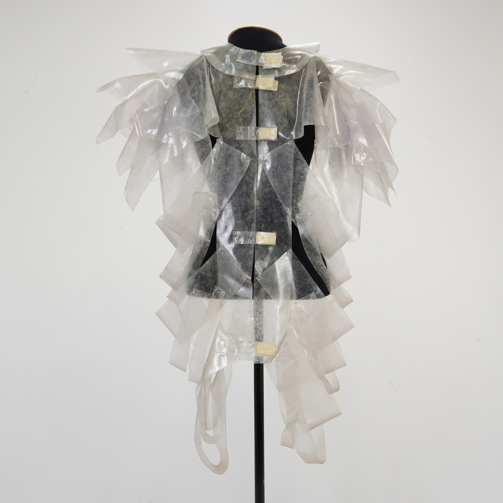 Blusa de plástico com transparência, estruturada com tiras no ombro e corpo, criando camadas unidas por fio de nylon, com aplique redondo no centro frontal e fechamento no meio das costas com velcro