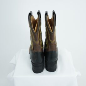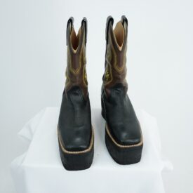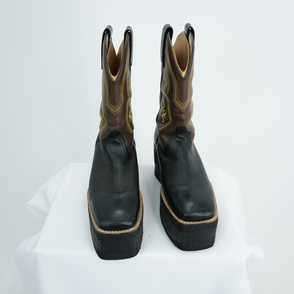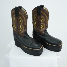 Bota plataforma Pozzo Voltar U.EG.21.002 (1) U.EG.21.002 (2) U.EG.21.002 (3) U.EG.21.002g (1) U.EG.21.002g (2) U.EG.21.002g (3) Metadados Miniatura Compartilhe Número de TomboU.EG.21.002gTítuloBota plataforma PozzoDescriçãoPar de botas estilo country marrom e prata, com plataforma reta preta, bordados nas laterais em amarelo e bege, faixa lateral em couro preto e bordados em preto na parte frontal superior, forro em couro begeLocalizaçãoSala 004EspetáculoEsperando GodotAutoria: figurinista/aderecista Sonia Ushiyama Quem vestiuPascoal da ConceiçãoPersonagemPozzo | MensageiroColeçãoColeção RepertórioDimensões do Item - altura x largura (cm)40 x 28Material/Composição do ItemCouroEstado de ConservaçãoBomData da Catalogaçãofevereiro 27, 2026 Mais Informações NotasMarca: "D'Milton" Figurino completo composto por: U.EG.21.002a - Camisa amarela Pozzo U.EG.21.002b - Calça verde Pozzo U.EG.21.002c - Blazer verde Pozzo U.EG.21.002d - Gravata verde Pozzo U.EG.21.002e - Chapéu Pozzo U.EG.21.002f - Luvas couro Pozzo U.EG.21.002g - Bota plataforma Pozzo Continuar navegando Luvas couro Pozzo Camisa Vermelho Preto Voltar para a lista de itens