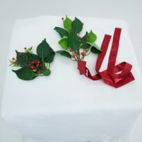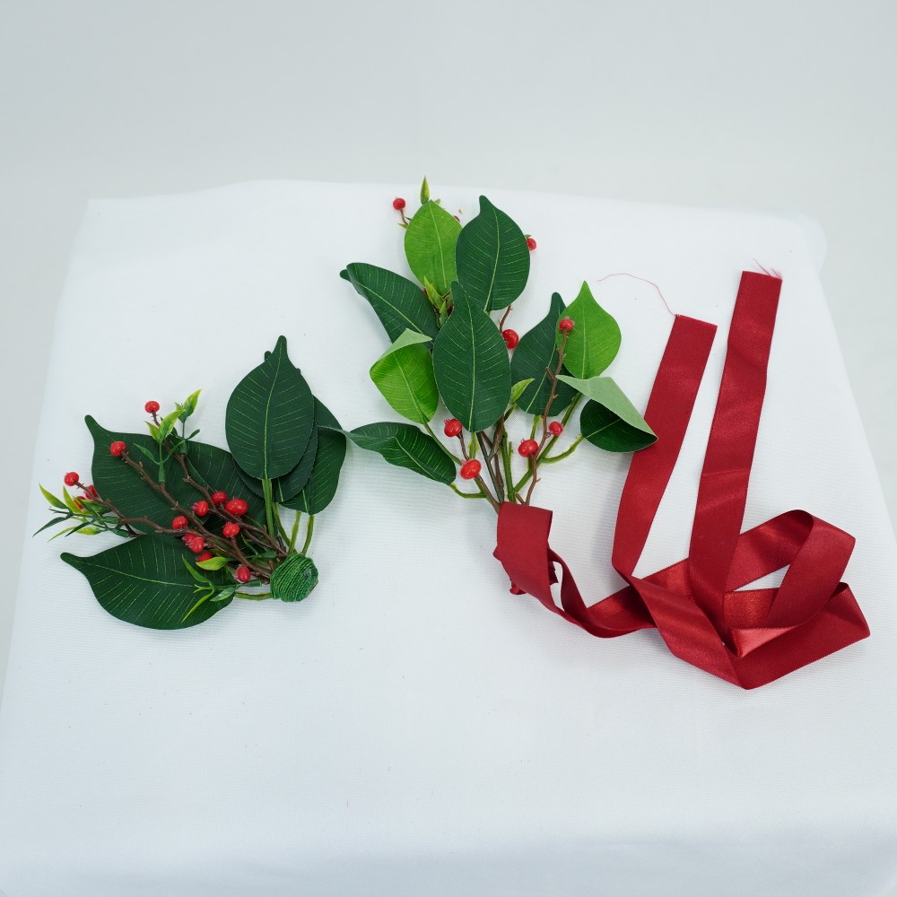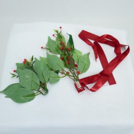Dois broches feitos a mão com folhas verdes e pequenos frutos vermelhos de plástico. Um deles com um ornamento de fita de cetim vermelha e fecho de broche na parte de trás