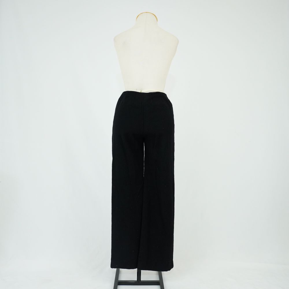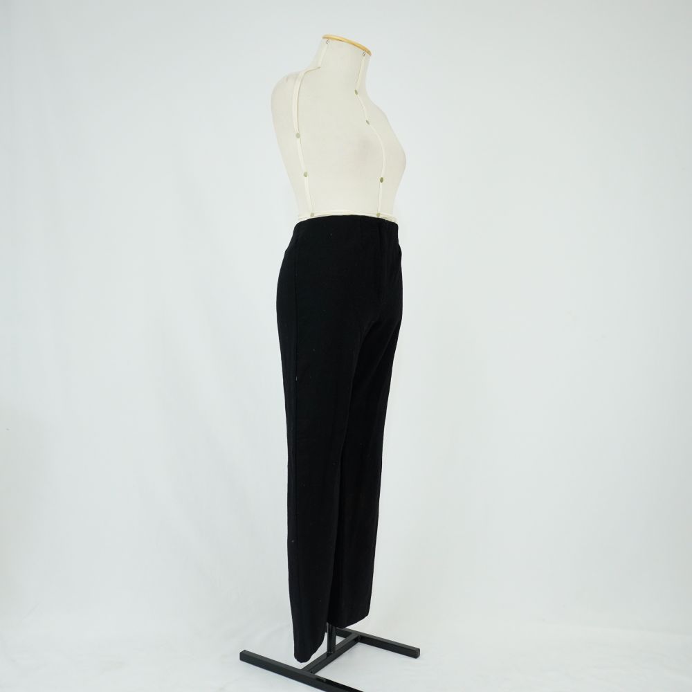 Calça de alfaiataria preta, sem cós, com fechamento em zíper e colchete de gancho. Possui duas pences frontais e quatro pences traseiras na cintura da peça. Feita em tecido texturizado entretelado na cor preta, revel em fita sintética na cintura