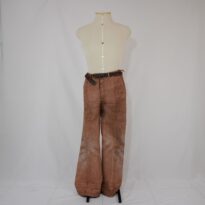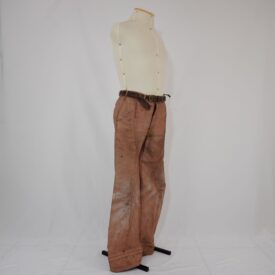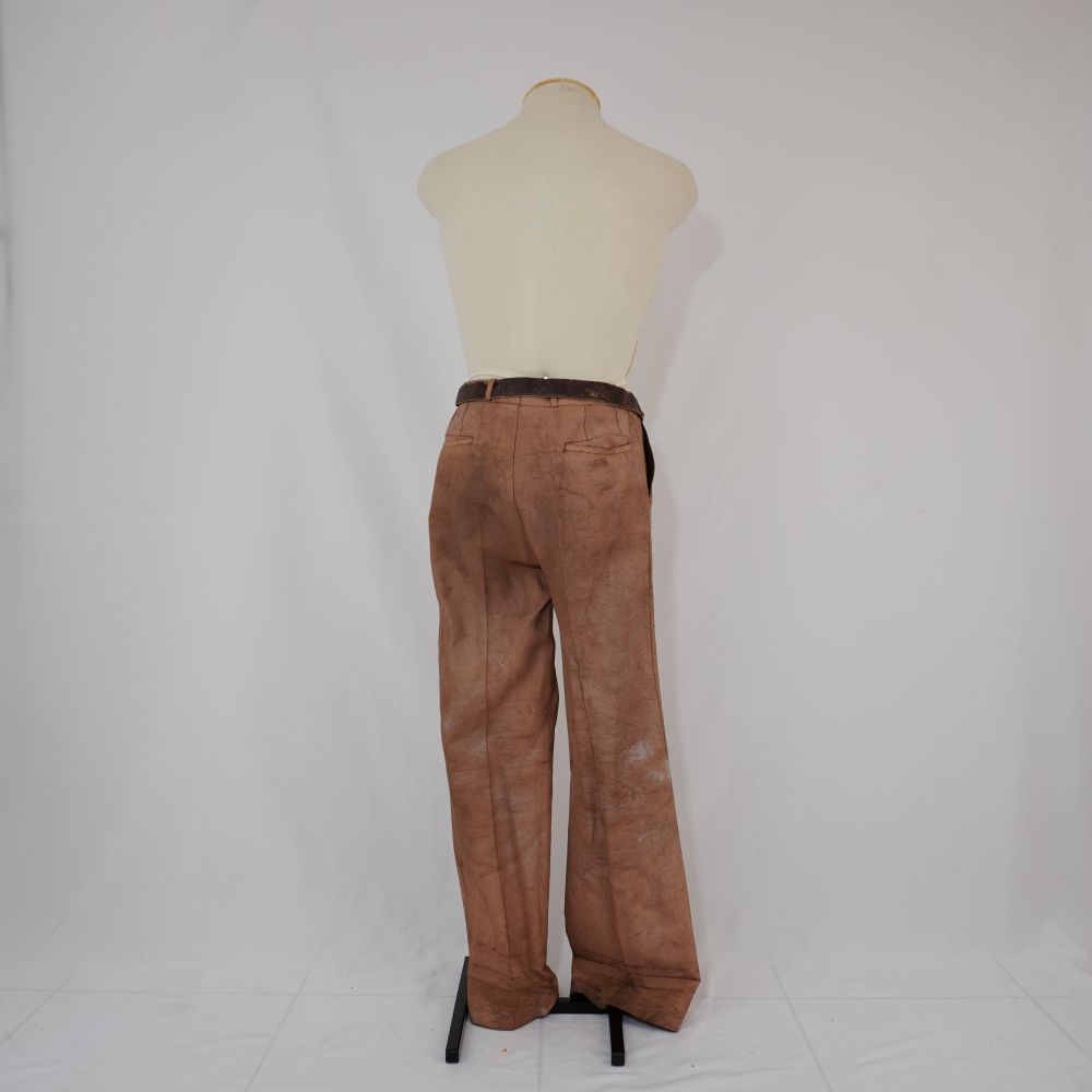 Calça alfaiataria pintada bege rosado Voltar U.BO.99.003b (2) U.BO.99.003b (3) Figurino completo - U.BO.99.003 (1) Figurino completo - U.BO.99.003 (2) Figurino completo - U.BO.99.003 (3) Metadados Miniatura Compartilhe Número de TomboU.BO.99.003bTítuloCalça alfaiataria pintada bege rosadoDescriçãoCalça reta alfaiataria, dois bolsos laterais frontais e dois embutidos nas costas, uma prega de cada lado na frente, peça pintada de bege rosado, fechamento em zíper de metal e botão de plásticoLocalizaçãoArara 013EspetáculoBoca de OuroAno do Espetáculo1999 | 2000 | 2001Autoria: figurinista/aderecista Olintho Malaquias PersonagemSeu AgenorColeçãoColeção RepertórioDimensões do Item - altura x largura (cm)108 x 50Material/Composição do Item67% poiléster 33% viscoseEstado de ConservaçãoRegularData da Catalogaçãooutubro 15, 2025 Mais Informações NotasFigurino completo composto por: Paletó pintado bege rosado - U.BO.99.003a Calça alfaiataria pintada bege rosado - U.BO.99.003b Cinto de couro - U.BO.99.003c Continuar navegando Paletó pintado bege rosado Cinto de couro Voltar para a lista de itens