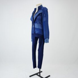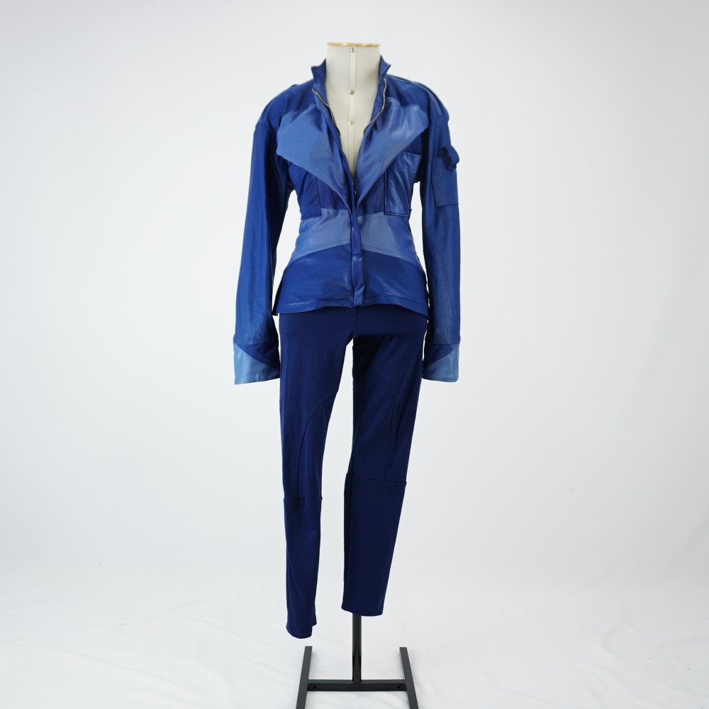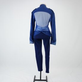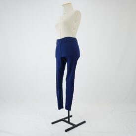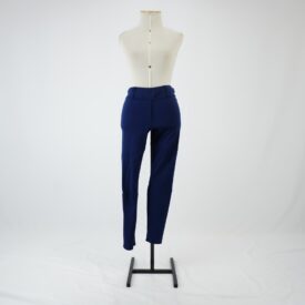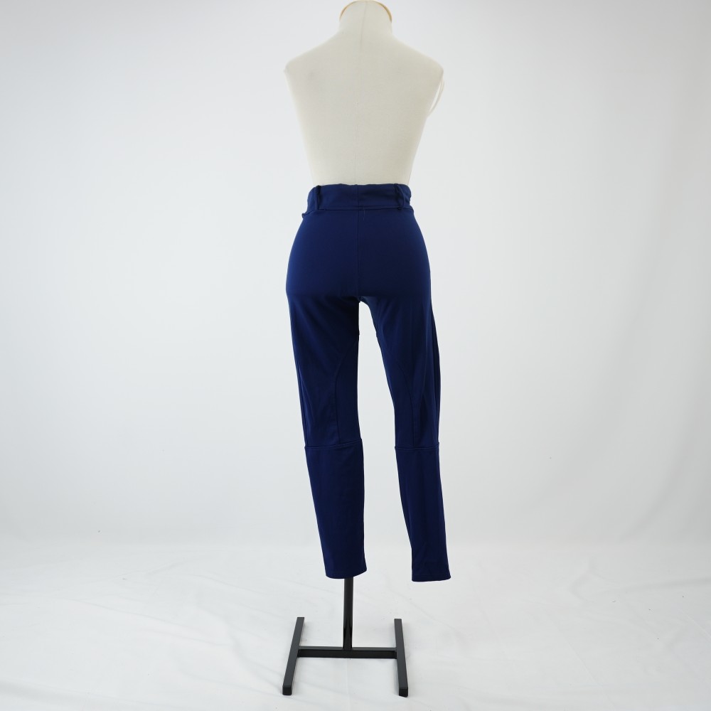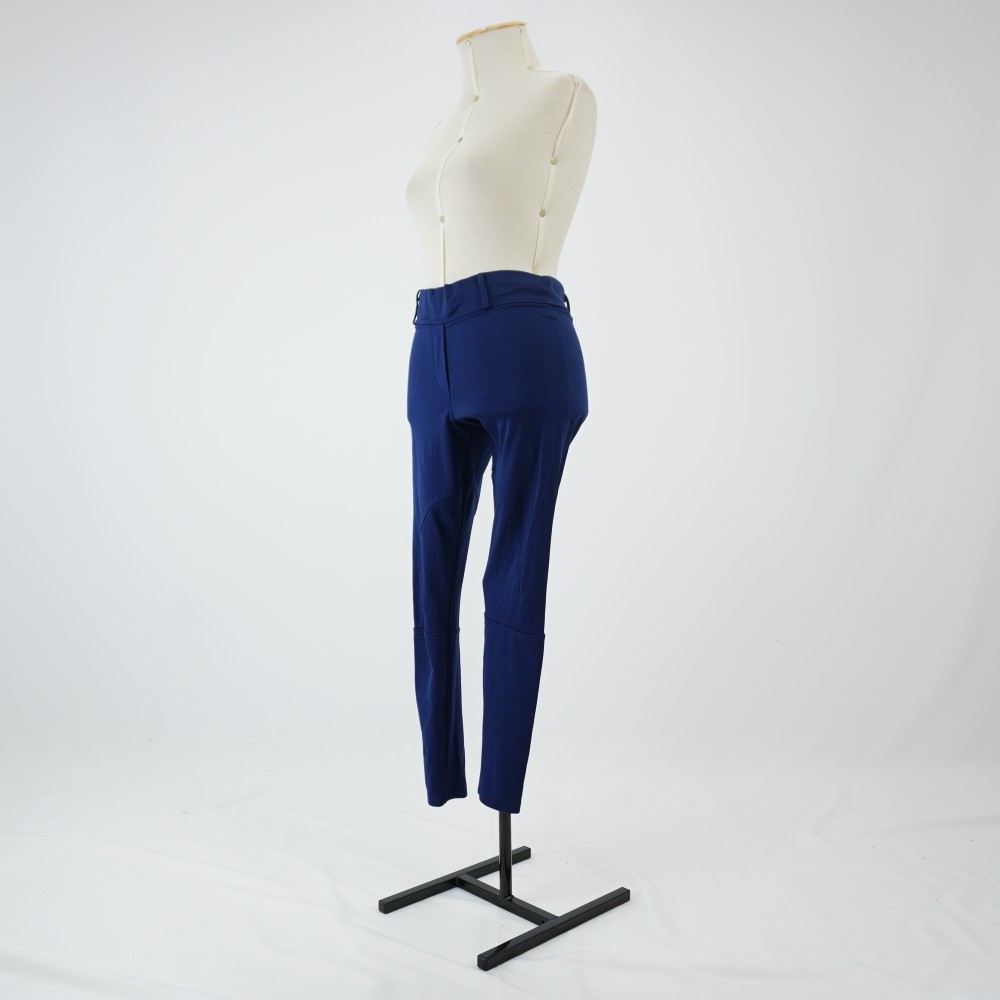 Calça tipo montaria com modelagem justa ao corpo na cor azul marinho, cós com elástico embutido e quatro passantes, vista decorativa e recortes arredondados no entre pernas e na barra, característicos de calça de montaria, barra de galoneira