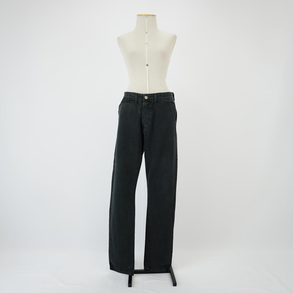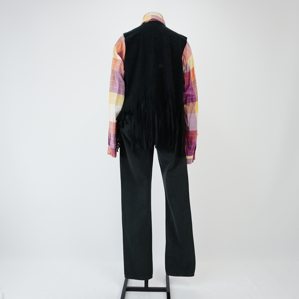 Calça de sarja preta Voltar U.RO.18.030c (1) U.RO.18.030c (2) U.RO.18.030c (3) Figurino completo U.RO.18.030 (1) Figurino completo U.RO.18.030 (2) Figurino completo U.RO.18.030 (3) Metadados Miniatura Compartilhe Número de TomboU.RO.18.030cTítuloCalça de sarja pretaDescriçãoCalça preta, 3 bolsos frontais sendo 1 embutido, 2 traseiros embutidos, 2 pences traseiras com bordado em formato de tesoura, 5 passantes, fechamento com 4 botões de pressão de jeansLocalizaçãoSala 008EspetáculoRoda VivaAno do Espetáculo2018Autoria: figurinista/aderecista Sonia Ushiyama Quem vestiuTony ReisColeçãoColeção RepertórioDimensões do Item - altura x largura (cm)112 x 54Material/Composição do ItemTecido plano Sarja 100% algodãoEstado de ConservaçãoBomData da Catalogaçãojaneiro 8, 2026 Mais Informações NotasFigurino completo composto por Camisa xadrez Roda Viva - U.RO.18.030a Colete preto franjas - U.RO.18.030b Calça de sarja preta - U.RO.18.030c Continuar navegando Colete preto franjas Macacão bege segunda pele Voltar para a lista de itens