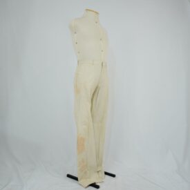 Calça Flávio de Carvalho Voltar U.C1.98.017b (2) U.C1.98.017b (3) Metadados Miniatura Compartilhe Número de TomboU.C1.98.017bTítuloCalça Flávio de CarvalhoDescriçãoCalça bege de alfaiataria com dois bolsos frontais e dois bolsos na parte de trás, fechamento em zíper e botãoLocalizaçãoArara 012EspetáculoCacilda!Ano do Espetáculo1998Quem vestiuAriel BorghiPersonagemFlávio de CarvalhoColeçãoColeção RepertórioDimensões do Item - altura x largura (cm)113 x 43Material/Composição do ItemTecido sintético, zíper e botãoEstado de ConservaçãoRegularData da Catalogaçãooutubro 9, 2025 Mais Informações NotasFoi usado em Sertões. Escrito "Fran H - II" | Figurino completo composto por: Blazer Flávio de Carvalho - U.C1.98.017a Calça Flávio de Carvalho - U.C1.98.017b Continuar navegando Blazer Flávio de Carvalho Blazer bege Coro de Pina Bausch Voltar para a lista de itens