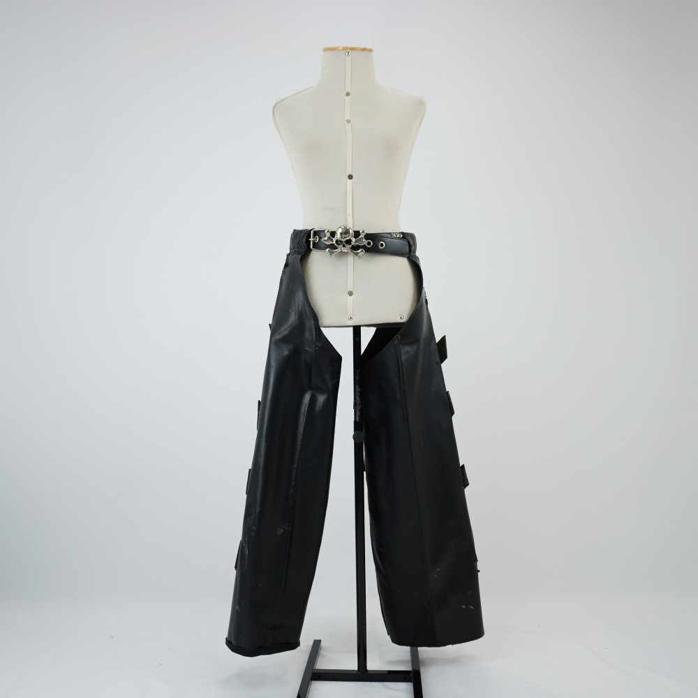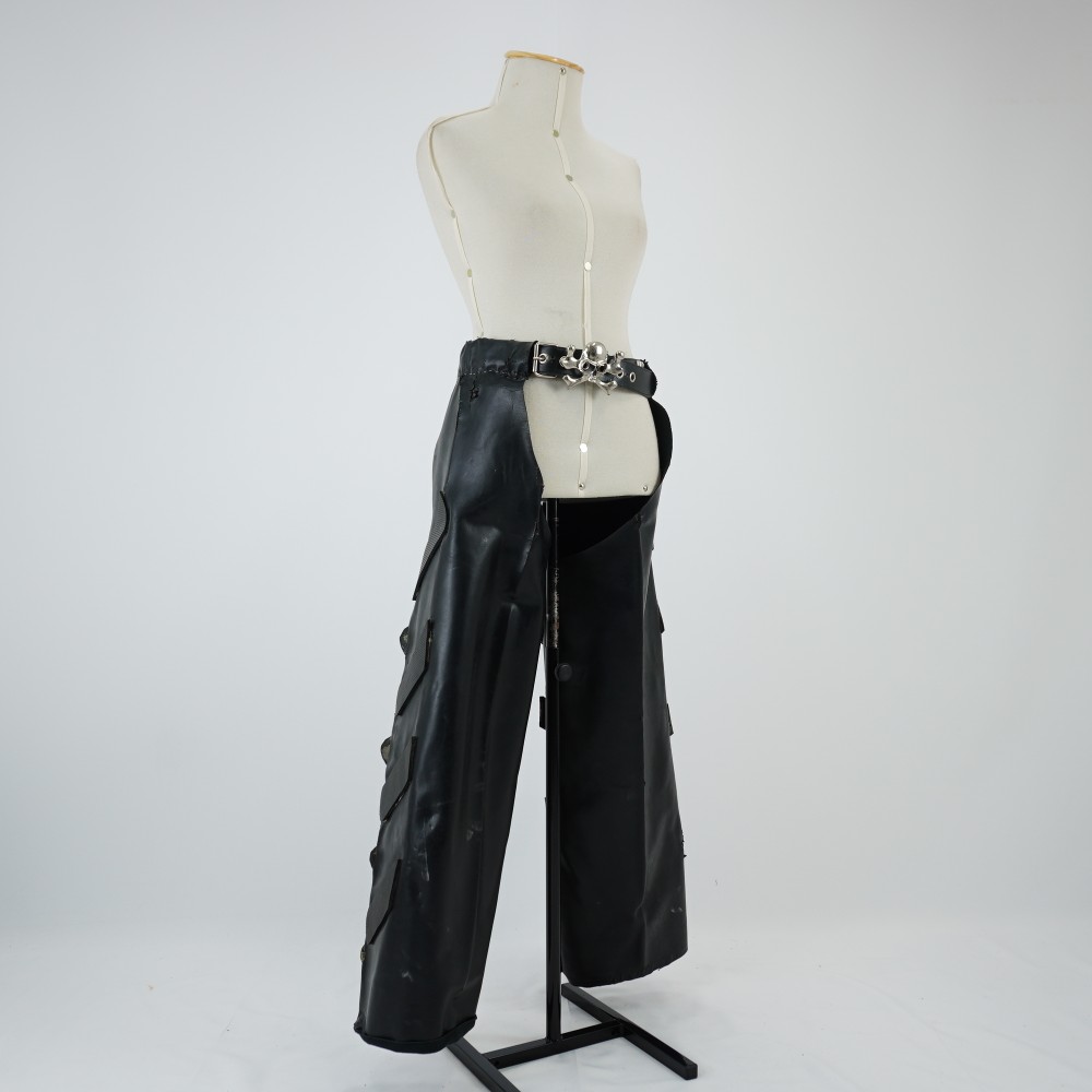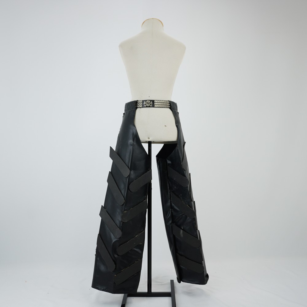 Calça preta estilo cowboy que imita couro, com apliques diagonais de EVA texturizados pretos em formato retangular com um dos lados arredondados colados nas costas. Cinto de couro preto com ilhóses, fivela, spikes piramidais e detalhes de caveira frente e costas prateados, acoplado no cós e costurado com fita de nylon