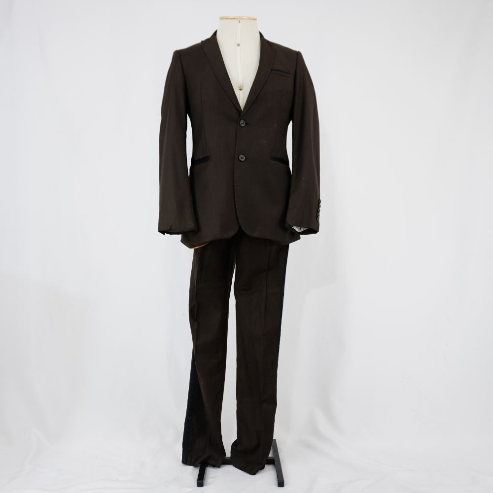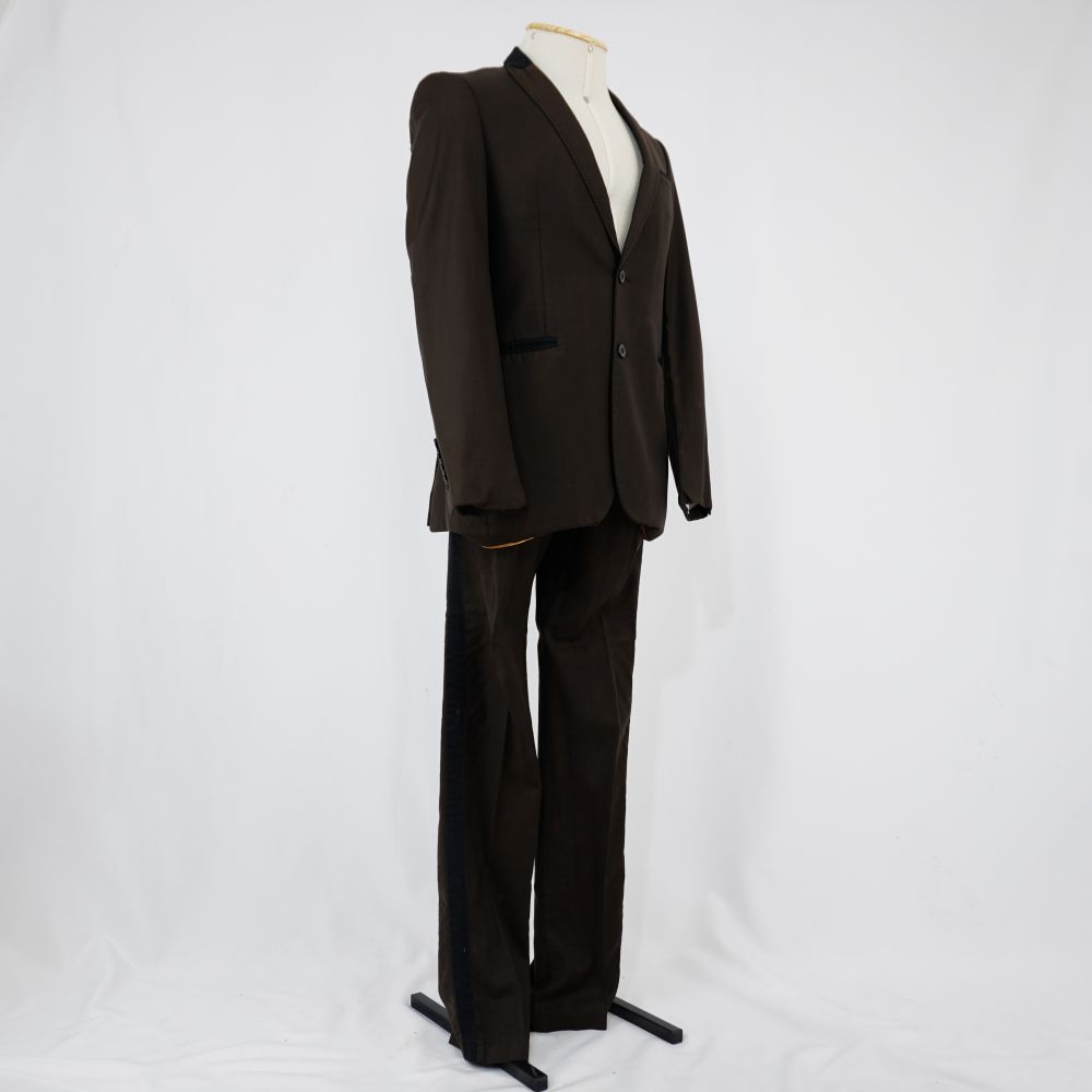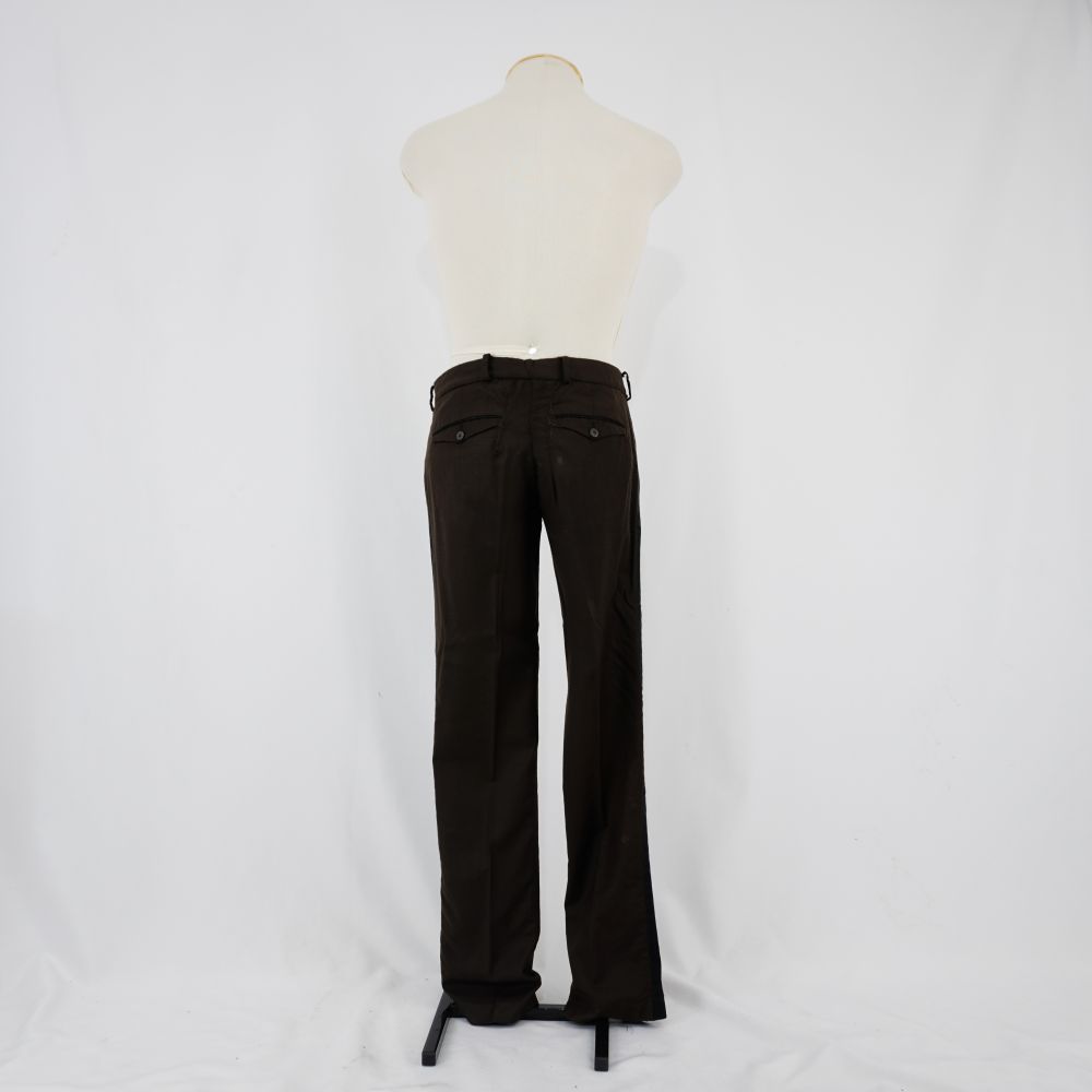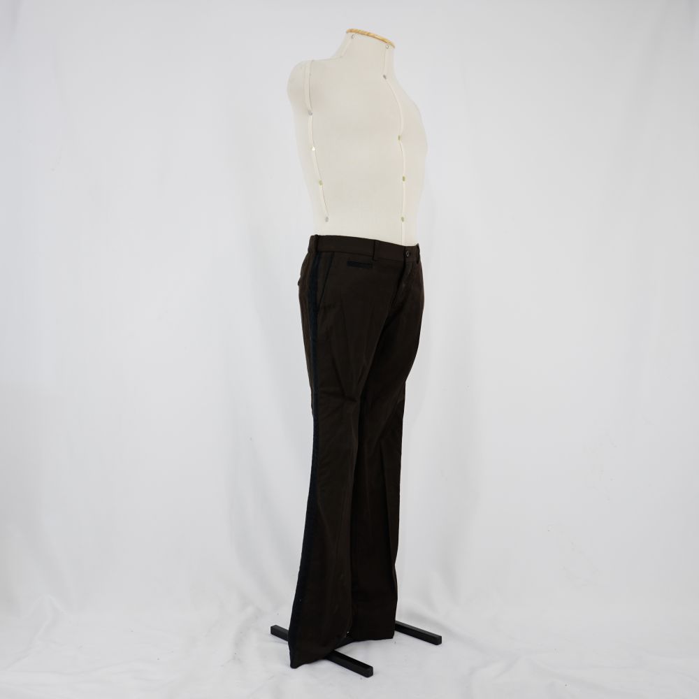 Calça reta marrom com 2 bolsos faca laterais e 2 bolsos traseiros com aba e fechamento de botão. 2 pences nas costas, 6 passantes, 1 bolso embutido na direita dianteira. Detalhes em cetim preto nos bolsos e faixas pretas em ambas laterais das pernas. Fechamento em zíper e 2 botões.