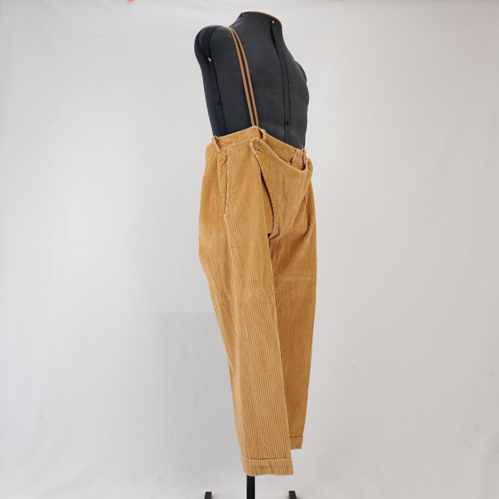 Calça caramelo, 2 pences traseiras, 2 bolsos faca, 7 passantes, aplicação frontal em formato triangular no cavalo á pelve fixa botões, suspensório marrom e bege listrado, fivela metálica, fechamento com zíper e colchete de alfaiate, barra aplicada imitando italiana