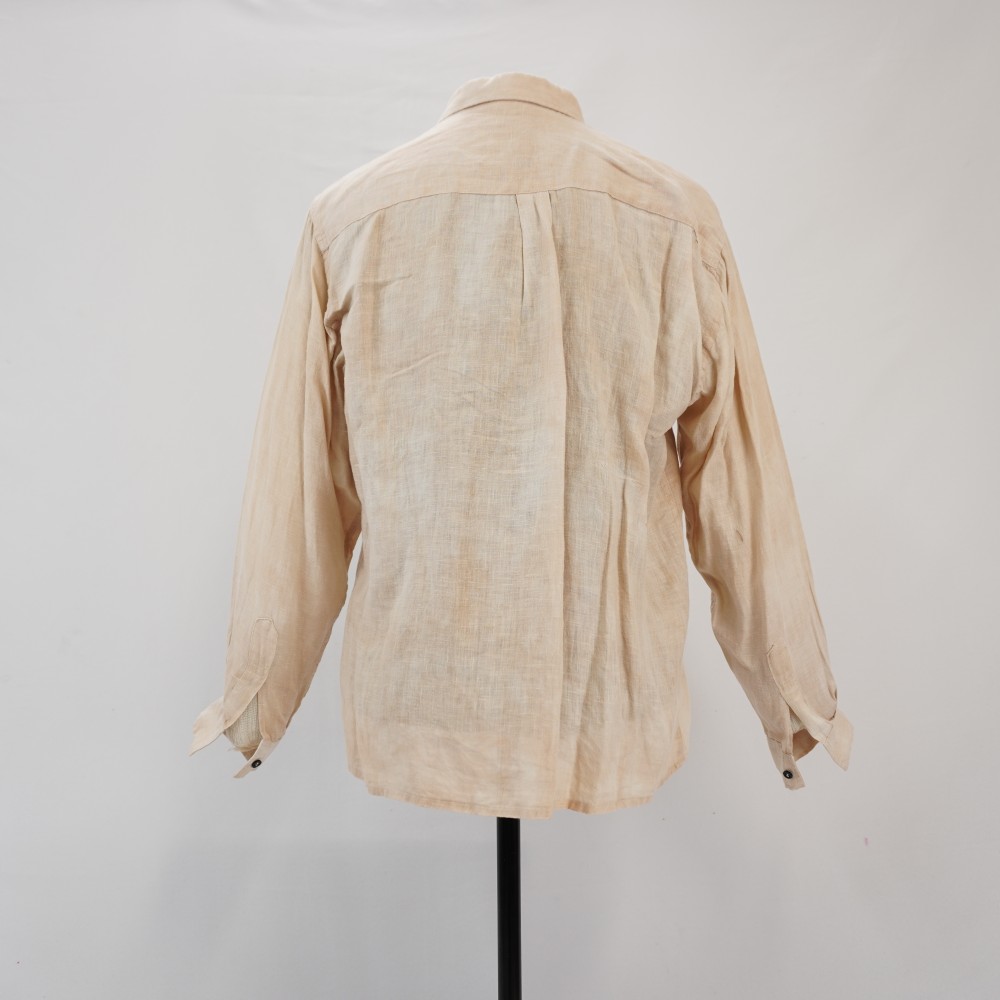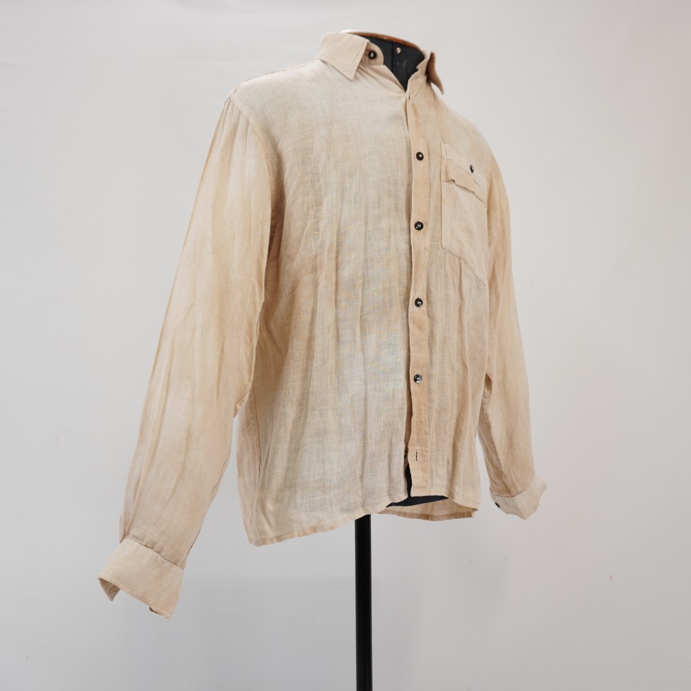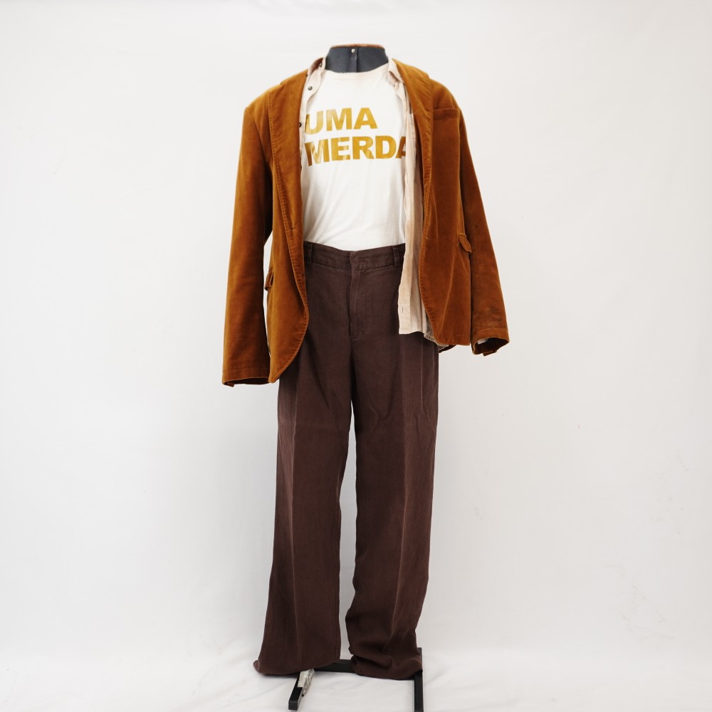 Camisa bege Roda Viva Voltar Figurino completo U.RO.18.007b (1) Figurino completo U.RO.18.007b (2) Figurino completo U.RO.18.007b (3) U.RO.18.007 (1) U.RO.18.007 (2) U.RO.18.007 (3) Metadados Miniatura Compartilhe Número de TomboU.RO.18.007bTítuloCamisa bege Roda VivaDescriçãoCamisa bege manga longa, com bolso aplicado na frente superior esquerda com pregas no topo e fechamento de botão, fechamento em vista simples com sete botões pretos e um em cada punhoLocalizaçãoSala 008EspetáculoRoda VivaAno do Espetáculo2018Autoria: figurinista/aderecista Sonia Ushiyama Quem vestiuMarcelo DrummondPersonagemManéColeçãoColeção RepertórioDimensões do Item - altura x largura (cm)77 x 70Material/Composição do ItemTecido plano 100% linhoEstado de ConservaçãoBomData da Catalogaçãodezembro 18, 2025 Mais Informações NotasFigurino completo composto por Camiseta "Uma Merda" Roda Viva - U.RO.18.007a Camisa bege Roda Viva - U.RO.18.007b Calça marrom Roda Viva - U.RO.18.007c Blazer caramelo Roda Viva U.RO.18.007d Continuar navegando Camiseta “Uma Merda” Roda Viva Calça marrom Roda Viva Voltar para a lista de itens