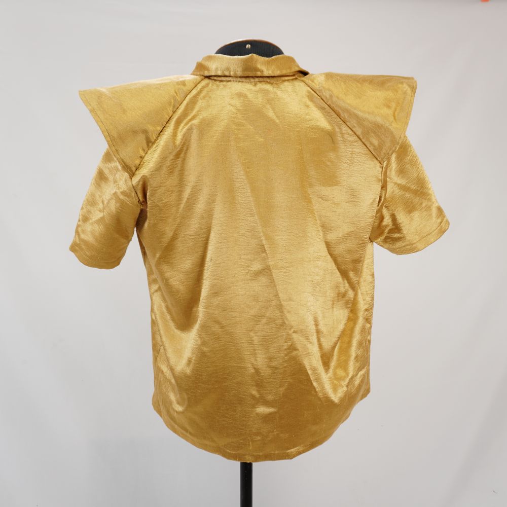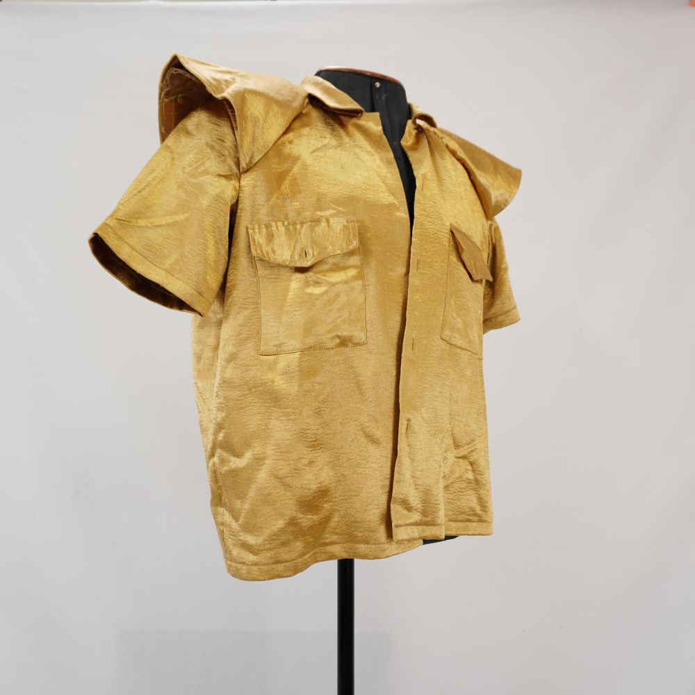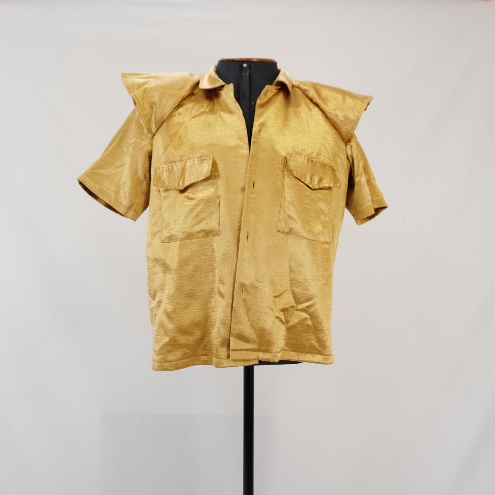 Camisa dourada manga curta, em duas camadas sendo a interna bege, dois bolsos de aba frontais, com detalhe de aba estruturada nos ombros com ombreira dupla de papelão com parte removível com velcro, recorte de malha rendada bege nas axilas