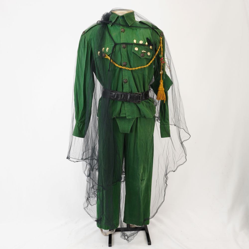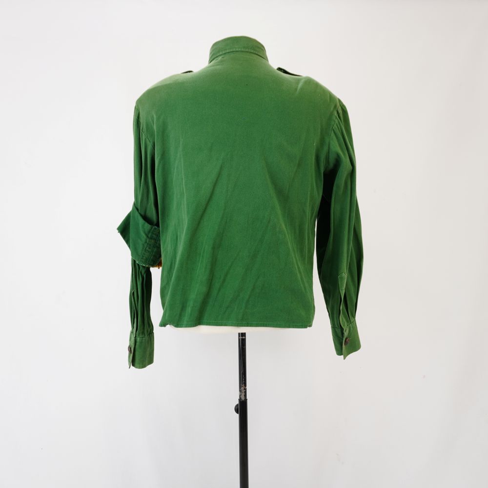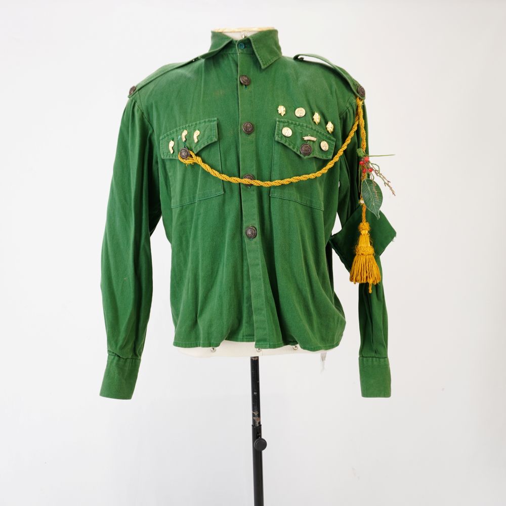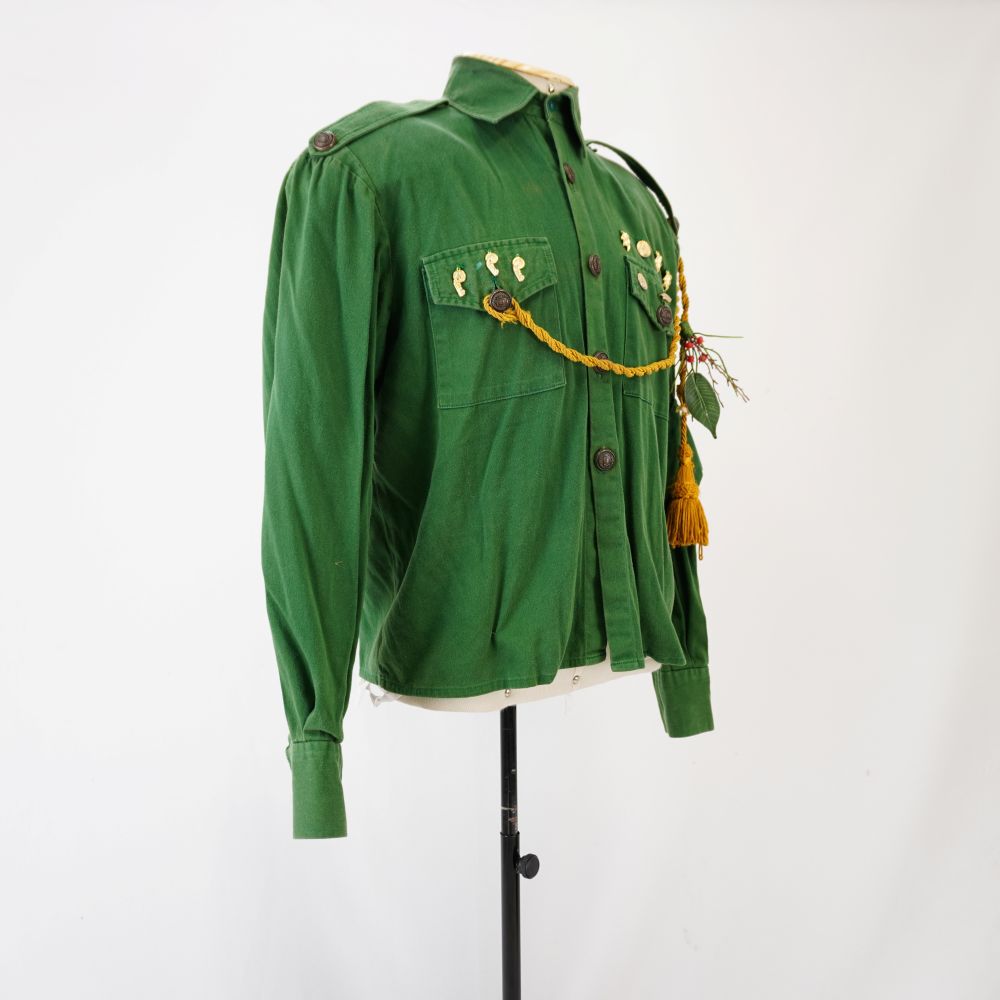 Camisa verde estilo exército com ombreira e martingale e nos ombros com botão. Dois bolsos aplicados com aba e fechamento de botão. Seis apliques dourados nas abas dos bolsos, sendo três em cada lado e quatro apliques extras acima da aba esquerda. Corda dourada com borla e broche de plantas verde e vermelha. Faixa verde aplicada no braço esquerdo. Aplique de elástico na barra para encaixar na perna.