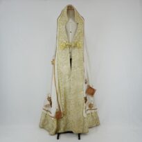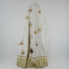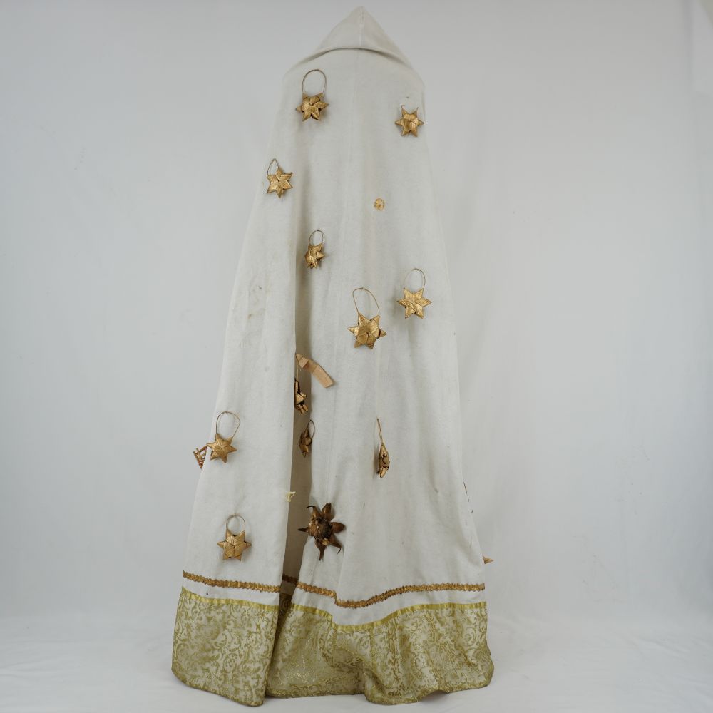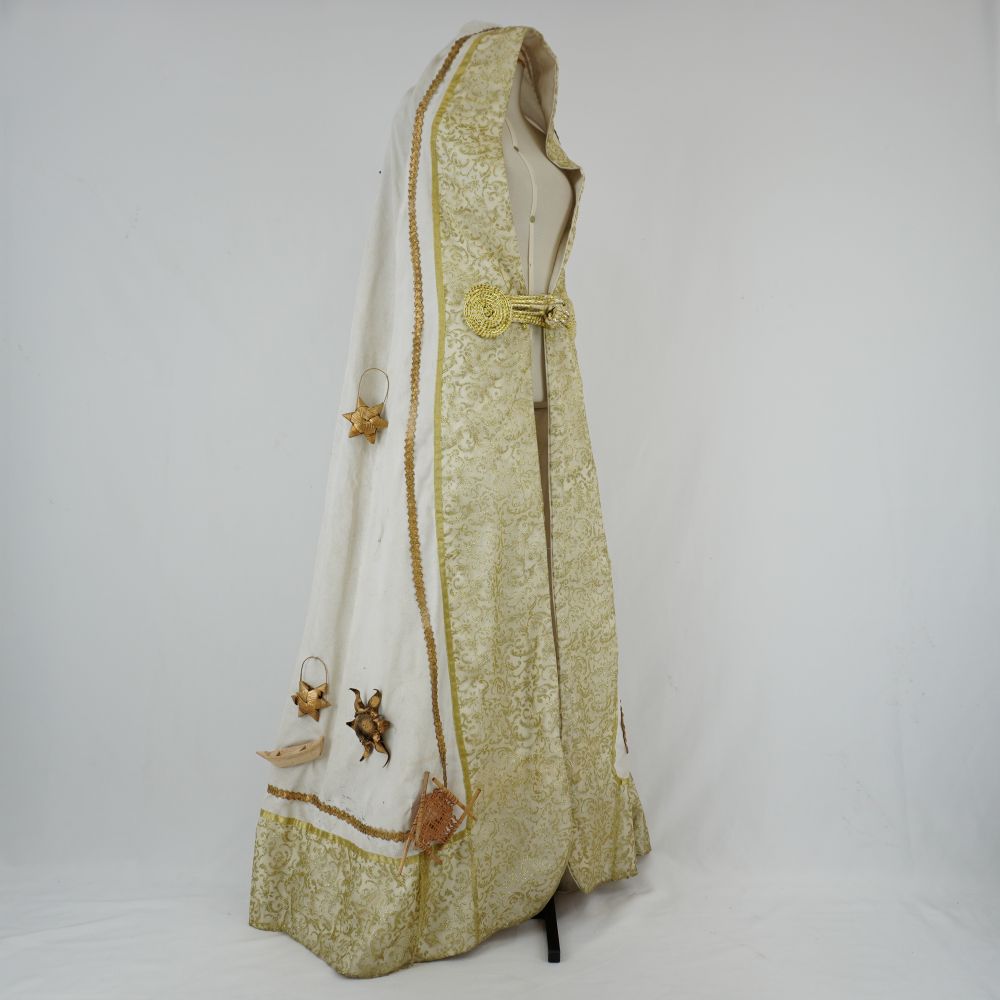Capa da santa, base de tecido branco com barrado em todo contorno dourado de tecido brocado com passamanaria dourada e de palha. Fechamento estilo oriental feito de barbante e fita dourada enrolada. Por todo manto apliques de palha esteiras cestarias flores secas.