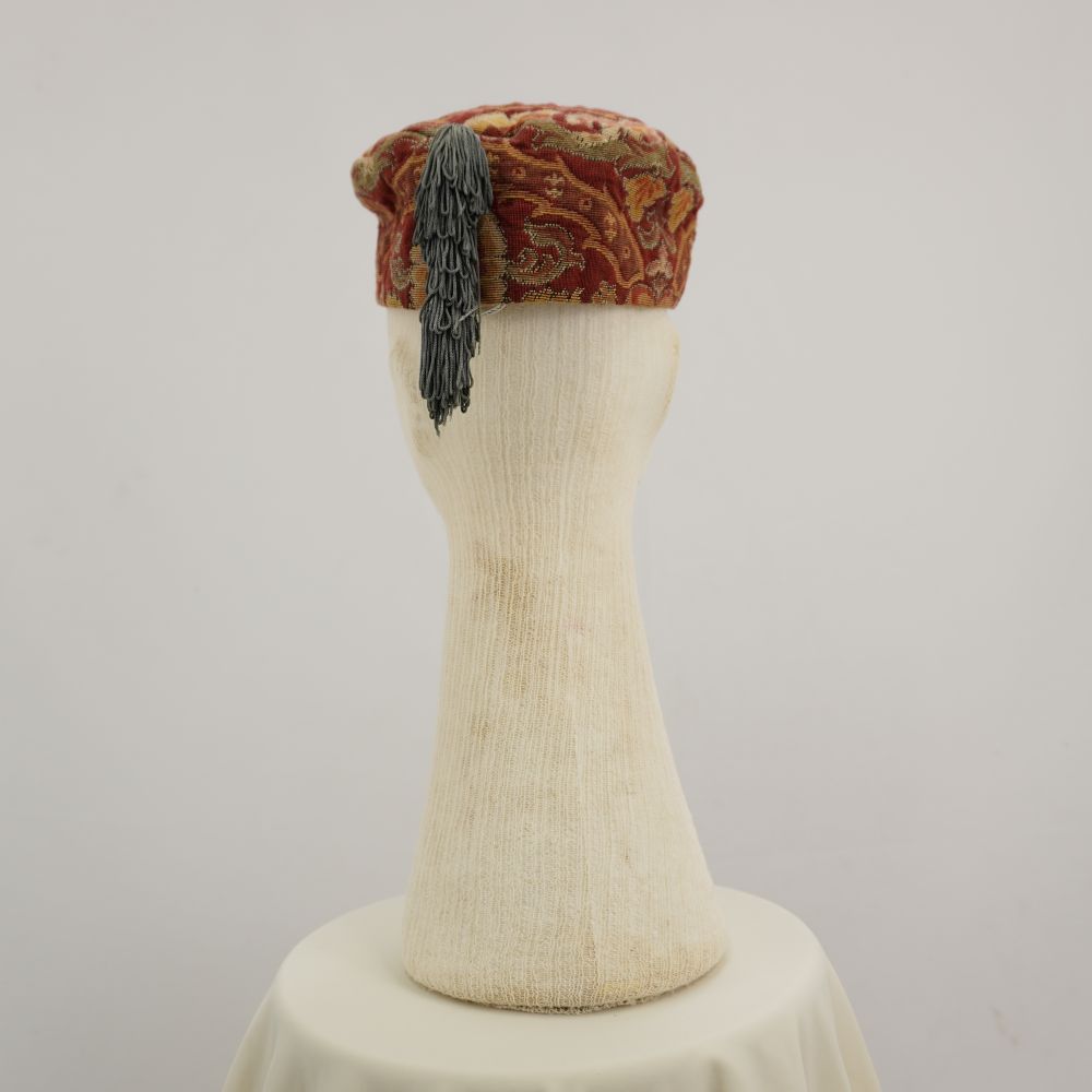 Chapéu tipo fez com passamentos florais em tons amarelo, laranja e vermelho, forro cor magenta, tassel de fios cinzas azulados na parte frontal, fixado na junção entre topo e lateral