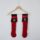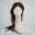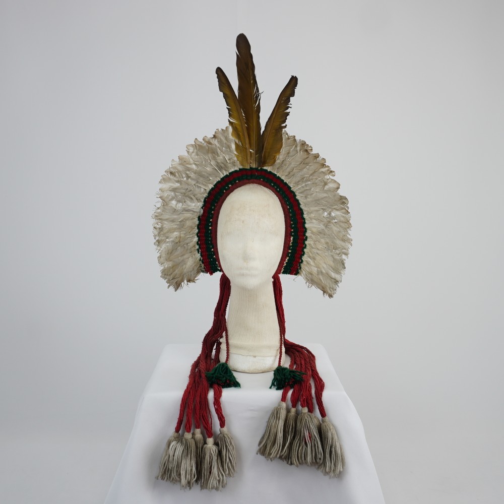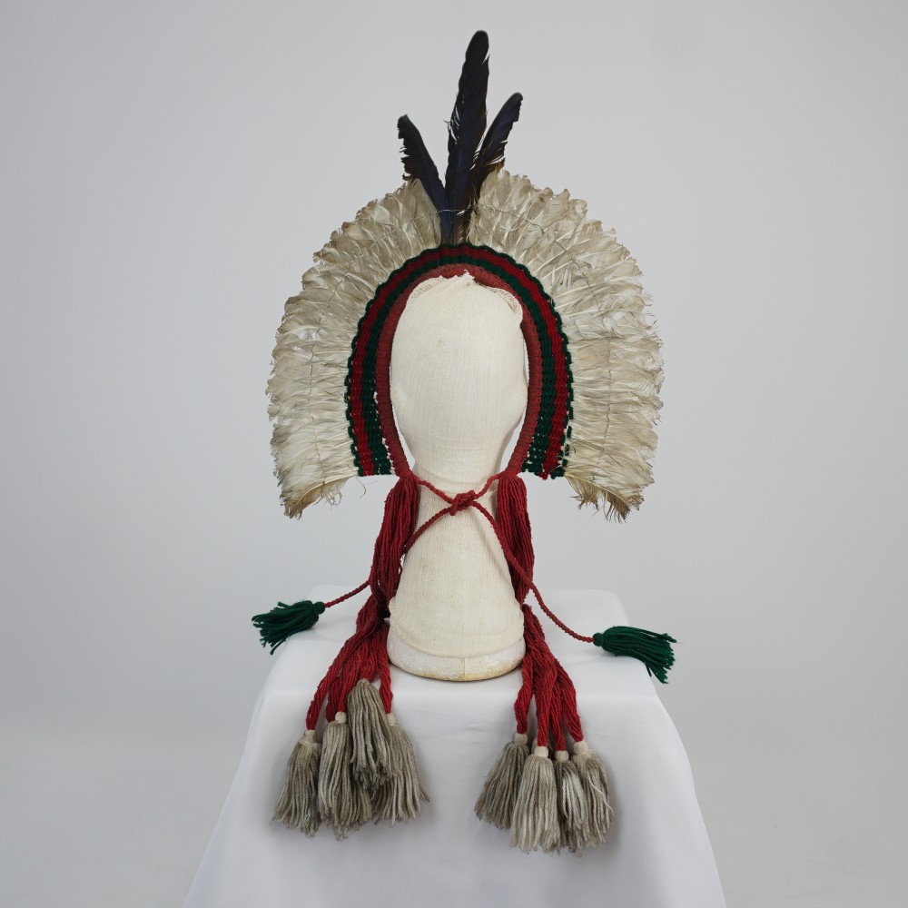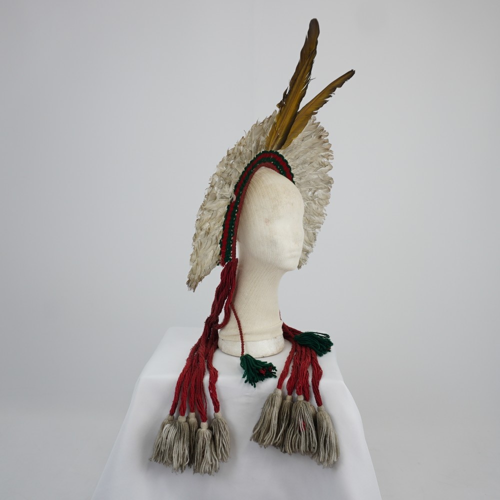 Cocar indígena com três grandes penas frontais azuis amarronzadas e amarelas atrás. Aproximadamente 60 penas brancas pelo resto da circunferência, tramadas com lã verde e vermelho em estrutura rígida tramadas com fios naturais vermelhos. Pendentes com borla de lã e dois cordões para amarração.