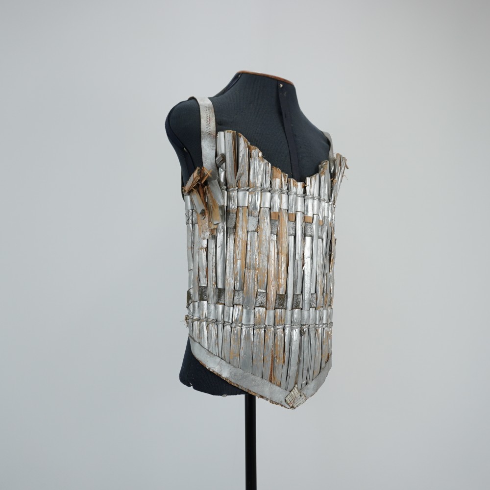 Colete em palha estruturado tramado com tiras de couro, pintado de tinta metálica prateada, alças de couro prateado e fechamento nas costas em duas tiras de couro com velcro nas pontas. Frente com formato do decote quadrado e barra em V e aplique colado espelhado na base da barra em formato geométrico