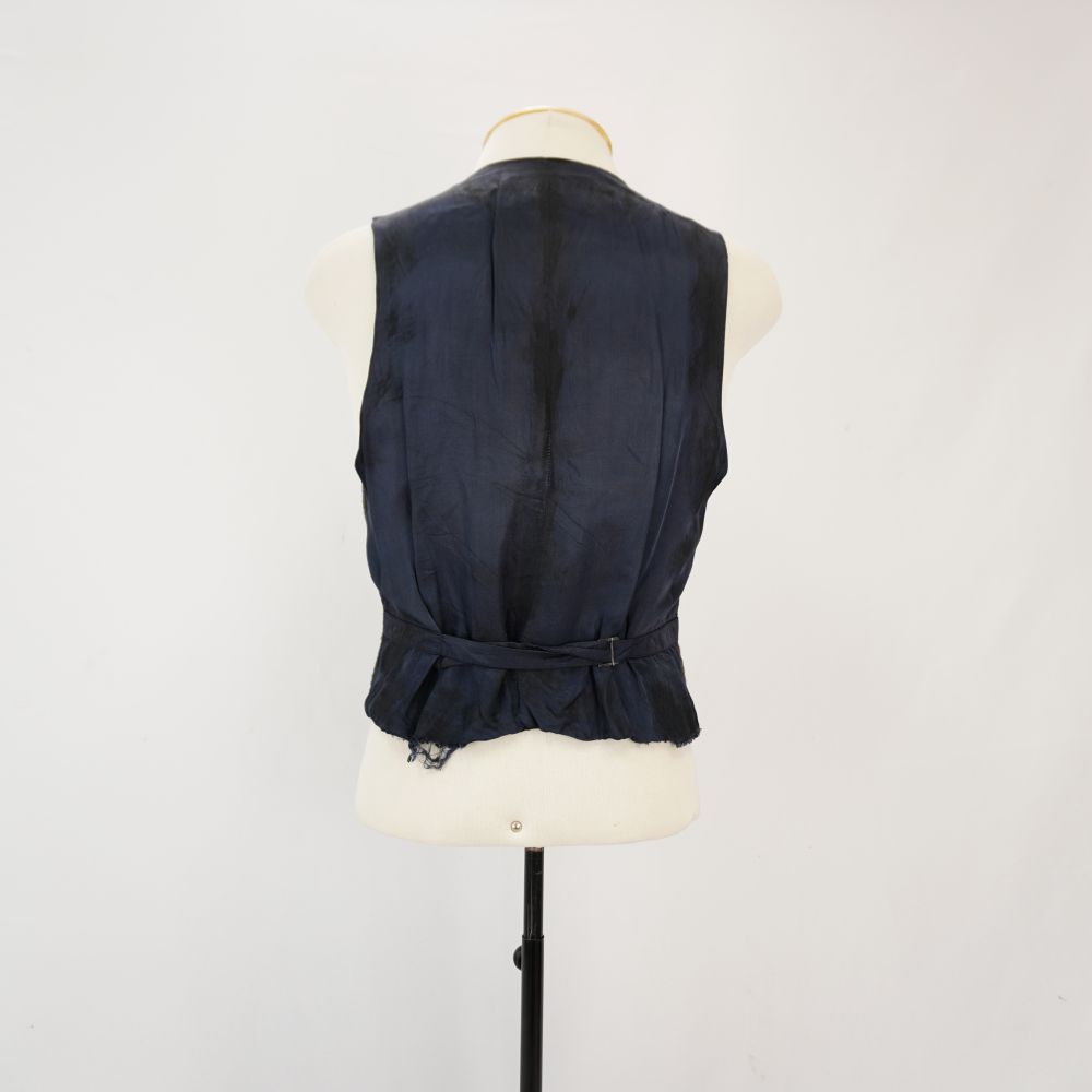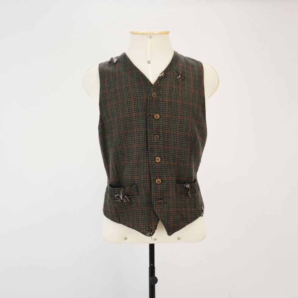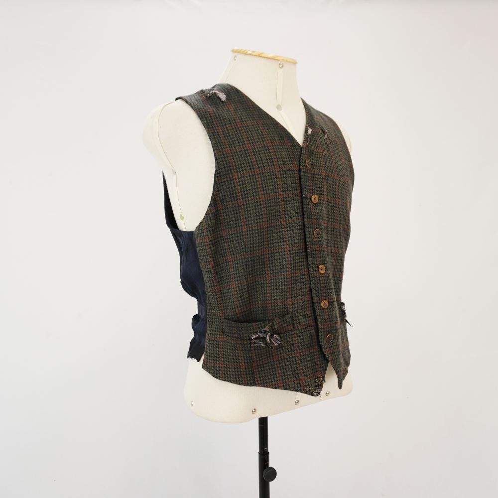 Colete com padronagem pied de poule nas marinho, verde musgo e vermelho, 2 bolsos embutidos frontais, fechamento frontal com 6 botões, envelhecimento cênico com tinta e rasgos, parte traseira de tecido acetinado marinho e tiras de ajuste com fivela metálica
