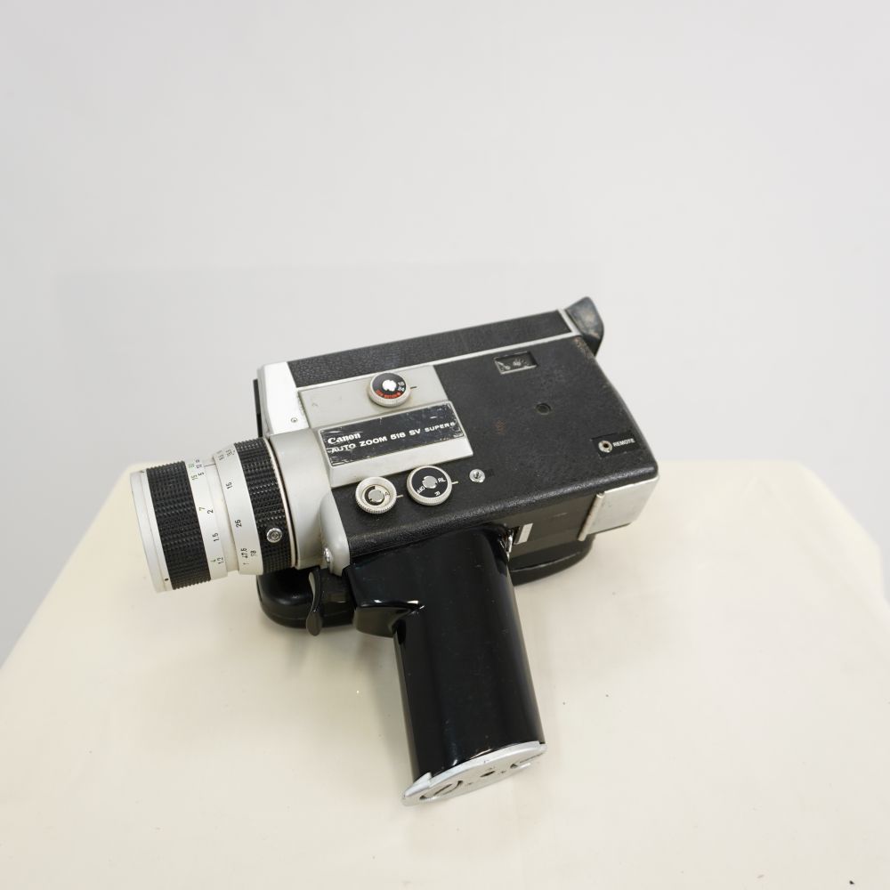 Filmadora Canon Zoom 518 SV, em metal prateado e plástico, acabamento preto fosco tipo couro, lente com anéis de ajuste e empunhadura em plástico preto
