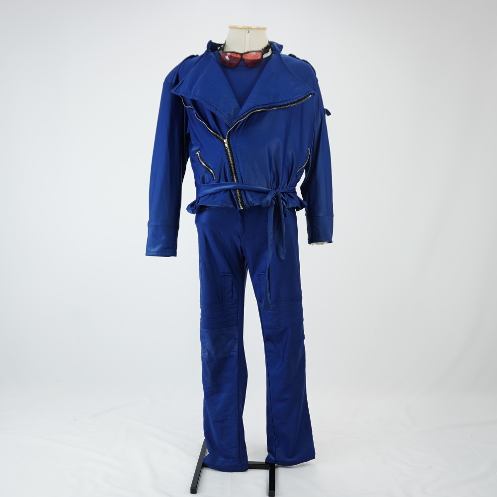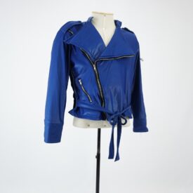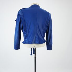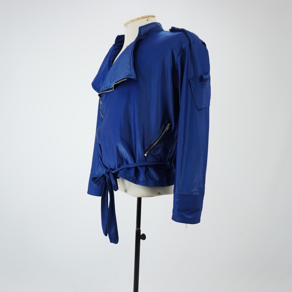 Jaqueta esportiva azul com dois bolsos frontais embutidos com fechamento de zíper, um bolso aplicado na manga esquerda com fechamento de colchete de pressão, martingalle matelassado nos ombros, ombreira embutida, duas pregas traseiras no comprimento próximo as laterais, barra frontal com faixa vinda das laterais, fechamento com zíper