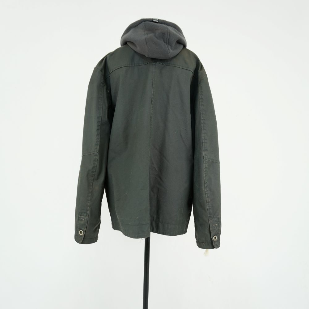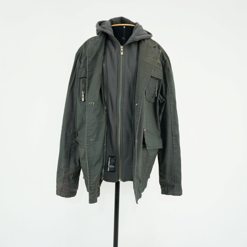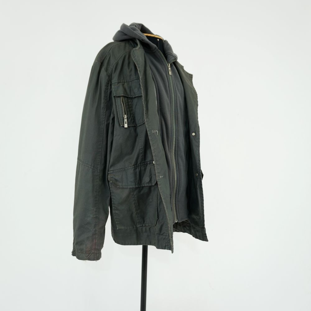 Casaco cinza chumbo modelagem híbrida de blazer e jaqueta com frente falsa destacável de moletom com capuz. Quatro bolsos aplicados com abas frontais sendo dois com zíper, 1 zíper ornamental na lateral frontal esquerda, fechamento frontal do moletom em zíper e do casaco com botões, forrado com dois botões em cada manga