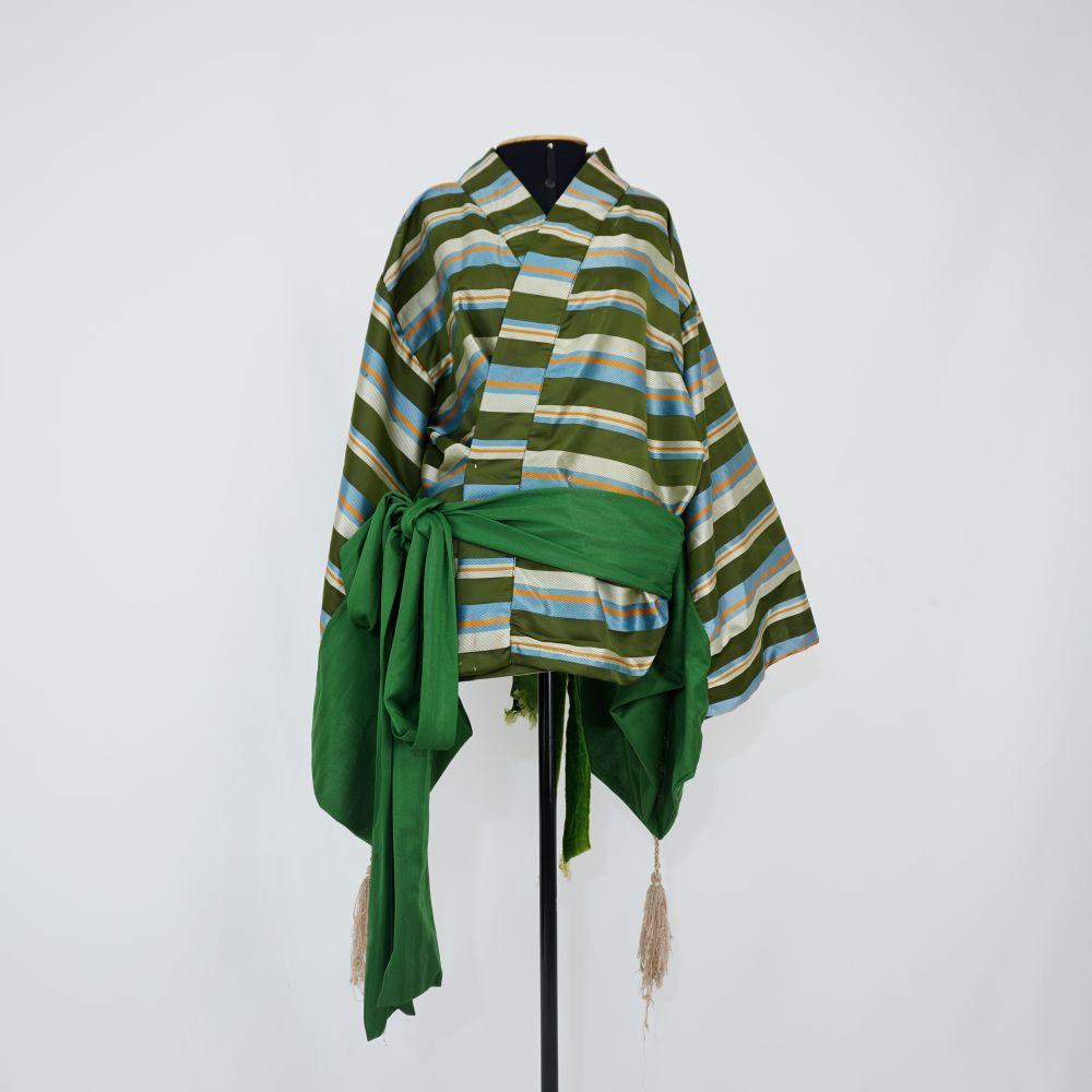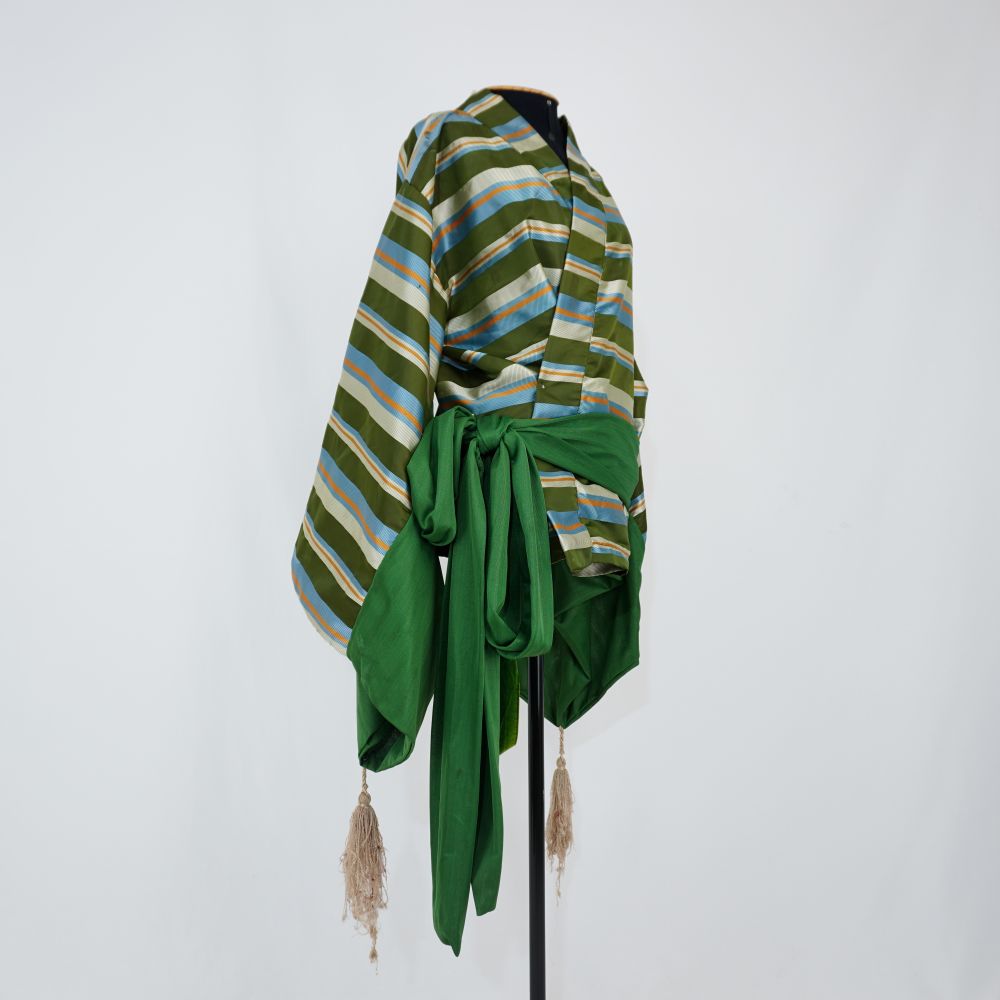 Blusa tipo kimono curto em tecido listrado, off white, verde, azul claro e laranja, com recorte nas mangas, forro e faixa da cintura em malha verde, pingente de franjas corcrome nas extremidades das mangas, frente transpassada e costurada. Fechamento nas costas com três amarrações em fita de veludo verde