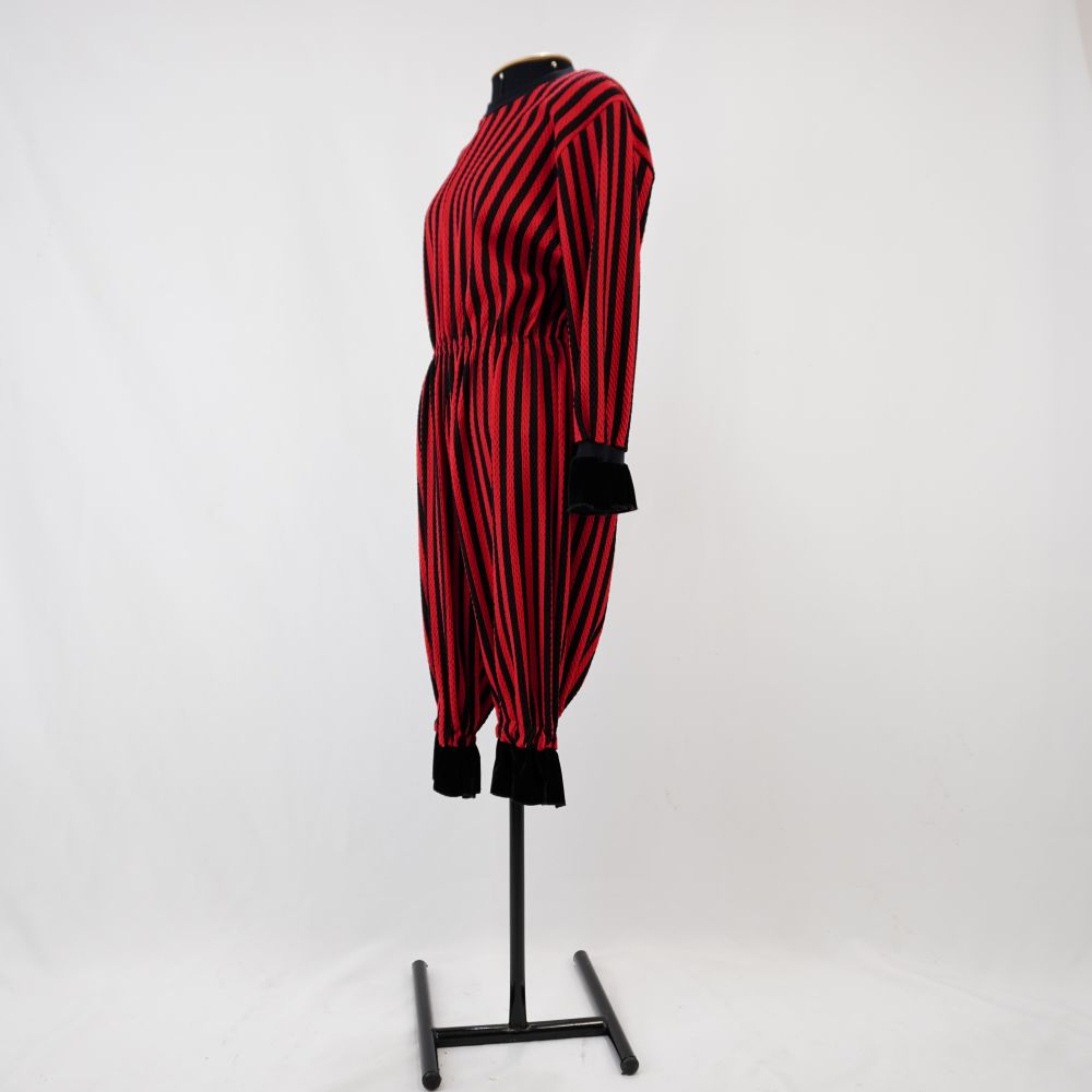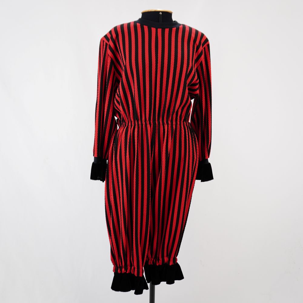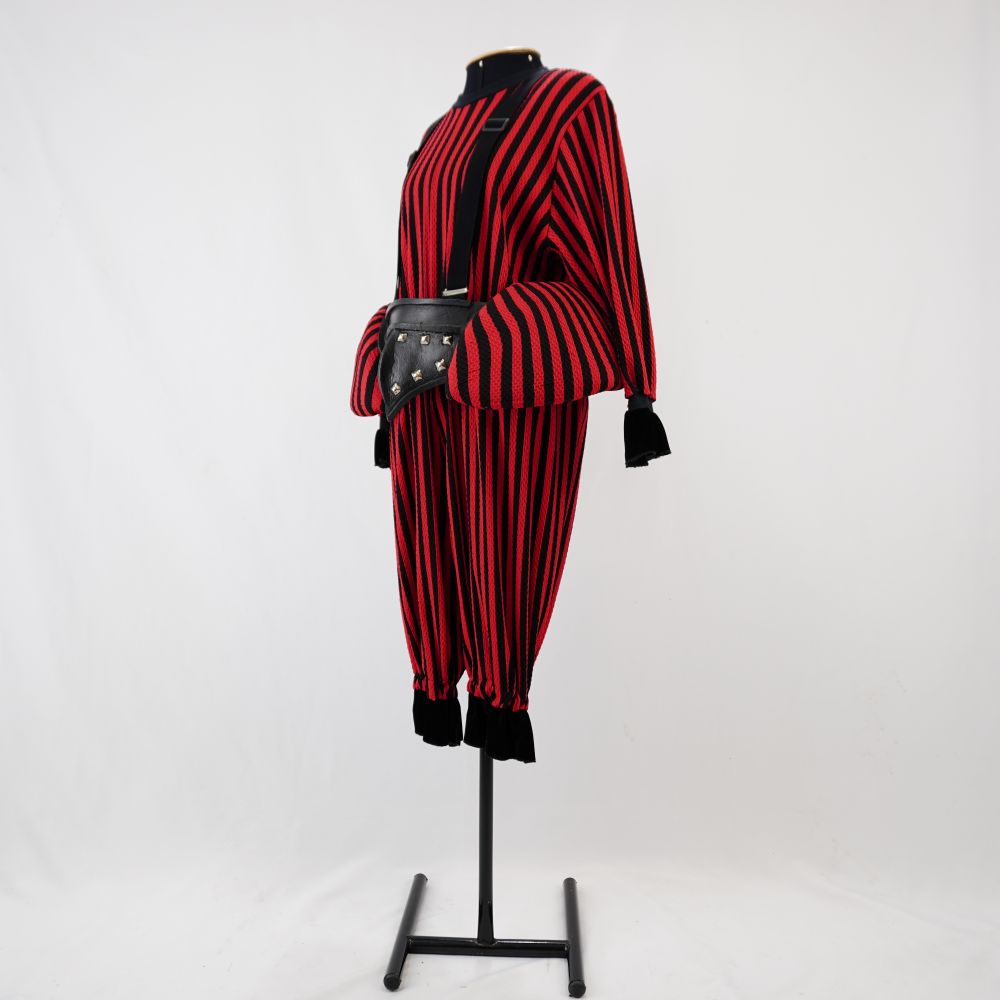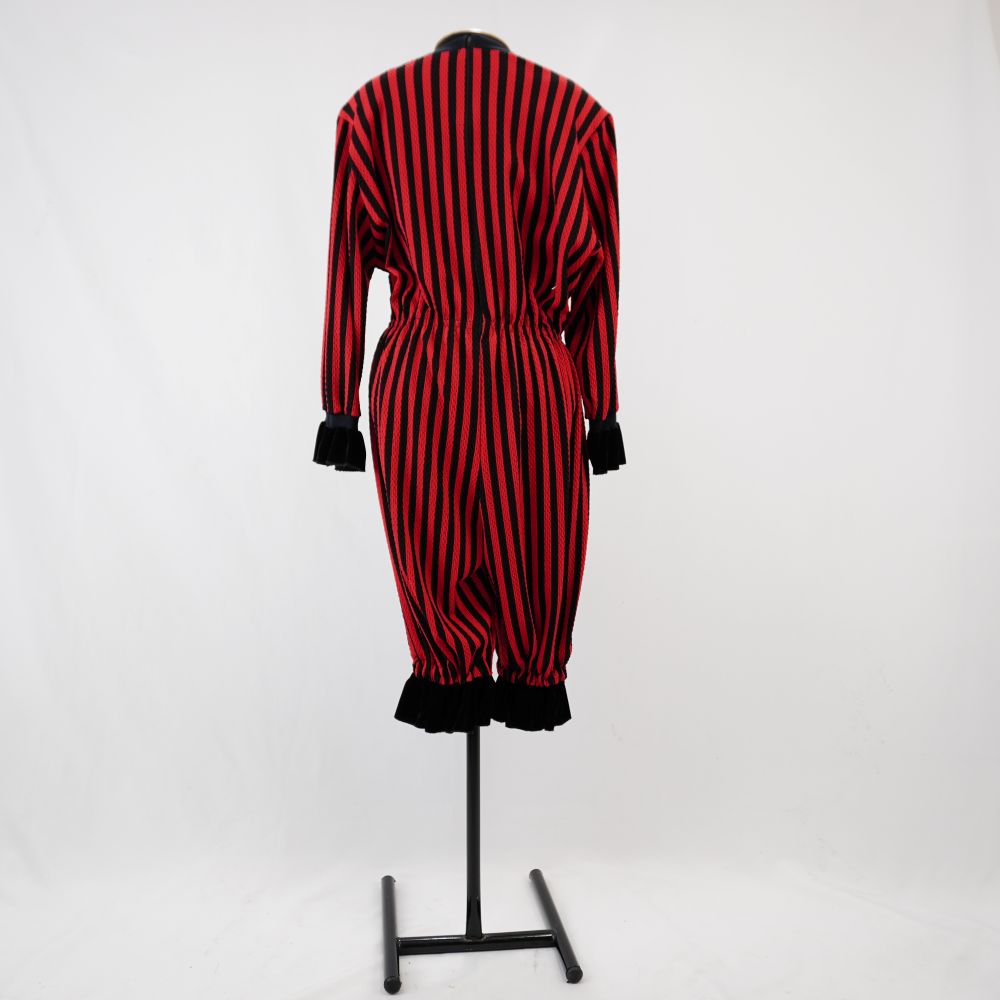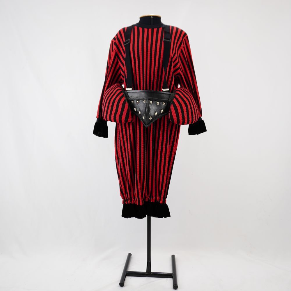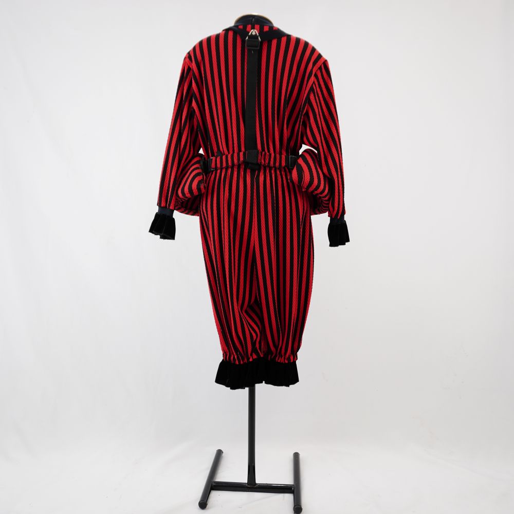 Macacão listrado vermelho e preto Voltar U.PR.01.001a (1) U.PR.01.001a (3) U.PR.01.001a (4) Figurino completo U.PR.01.001 (1) U.PR.01.001 (2) U.PR.01.001 (3) Metadados Miniatura Compartilhe Número de TomboU.PR.01.001aTítuloMacacão listrado vermelho e pretoDescriçãoMacacão listrado vermelho e preto verticalmente, manga longa, comprimento capri com elástico na cintura e na barra da perna, ribana preta no decote e nos punhos e babado de veludo preto nos punhos e barra da calça. Fechamento em zíper centro costasLocalizaçãoSala 003EspetáculoO Rei da VelaAno do Espetáculo2017Quem vestiuVera ValdezPersonagemTia PolocaColeçãoColeção de Peças RarasDimensões do Item - altura x largura (cm)107 x 63Material/Composição do ItemMalha waffle sintética, ribana com algodão e malha de veludo sintéticoEstado de ConservaçãoBomData da Catalogaçãodezembro 3, 2025 Mais Informações NotasVera fazia a Tia Poloca quando o zé não podia ou não queria fazer, esse figurino é de Vera e Zé tem uma versão dele maior Continuar navegando Par de meia branca rendada Túnica de tule preta Voltar para a lista de itens