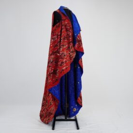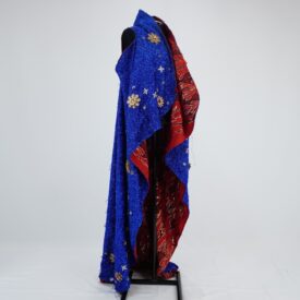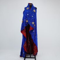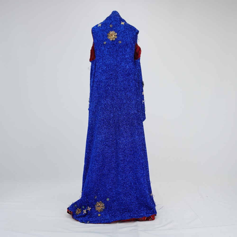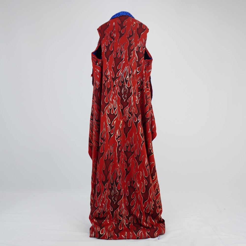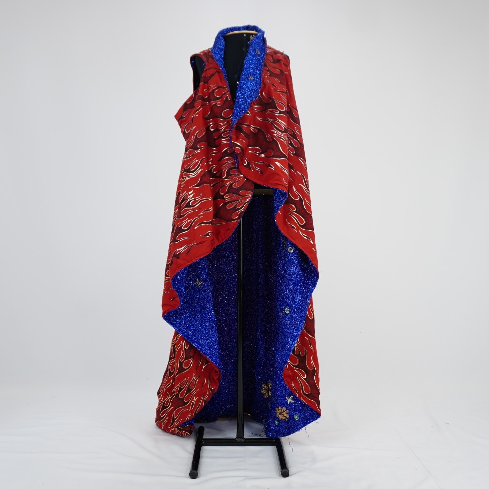 Manto azul com modelagem de colete alongado, dupla face sendo uma face de tecido metalizado azul e a outra de malha vermelha com estampa de chamas pretas e douradas. na face azul há aplicações de flores e estrelas douradas de tamanhos diferentes e com pedras azuis