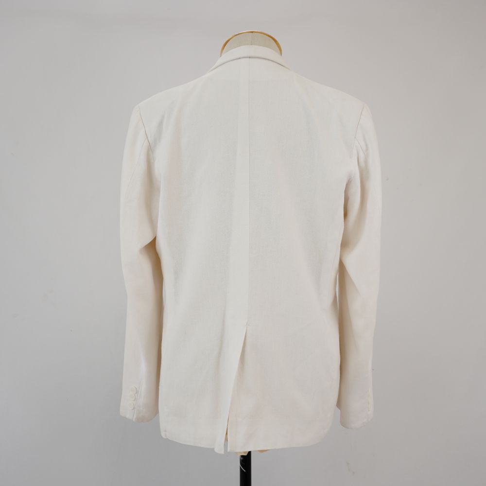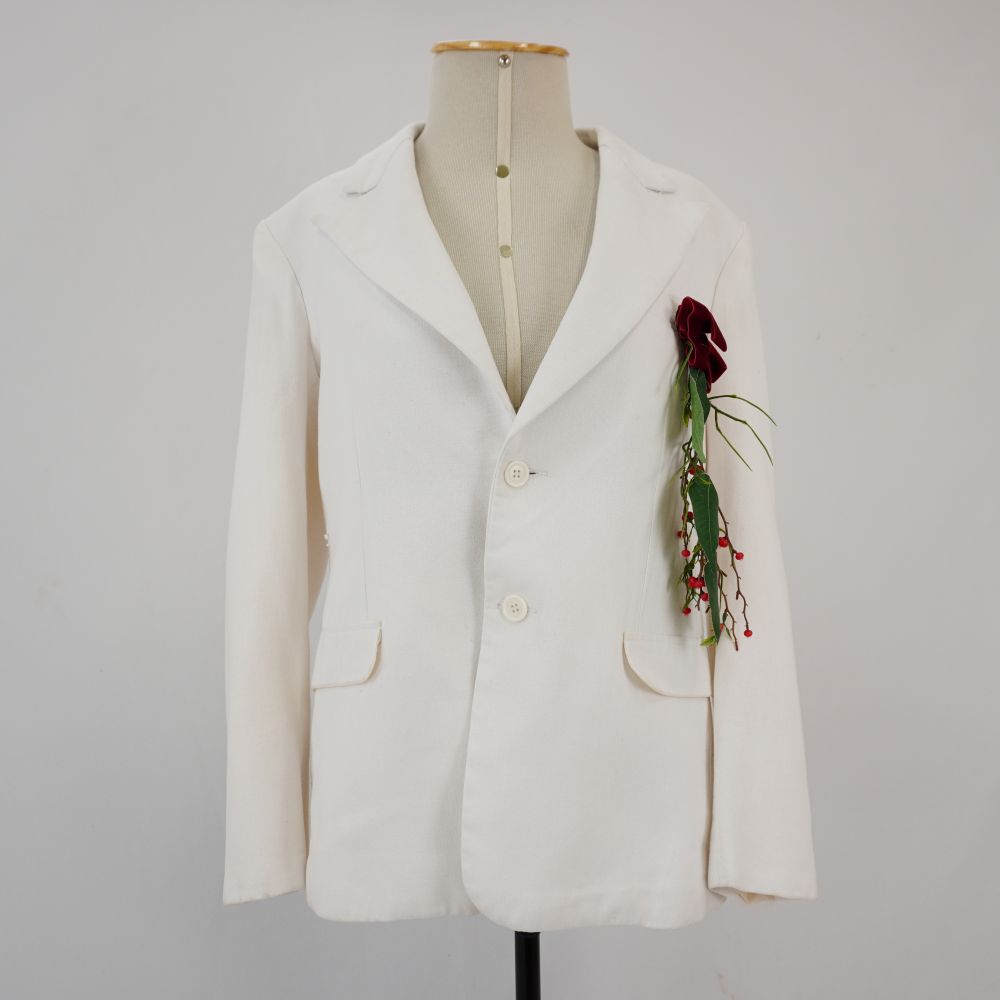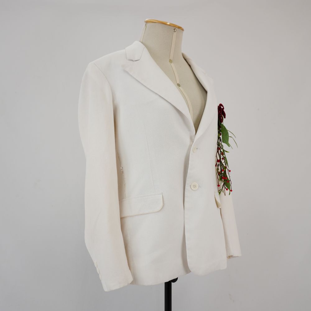 Paletó feminino branco com bolso embutido na lapela e dois bolsos frontais falsos. Fechamento em dois botões de plástico e três botões no punho. Possui forro. Broche com flores artificiais vermelhas de plástico e fita de veludo vermelho preso no bolso superior frontal.
