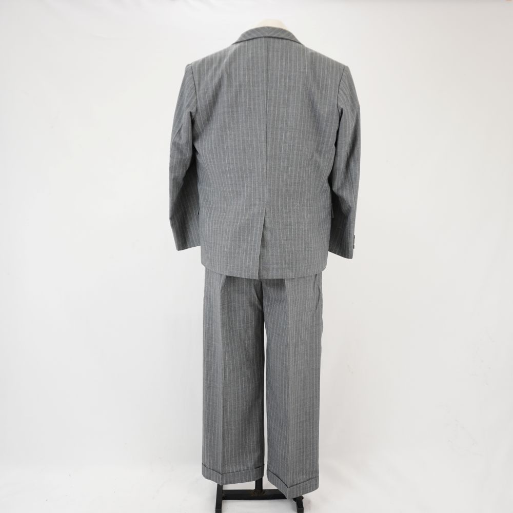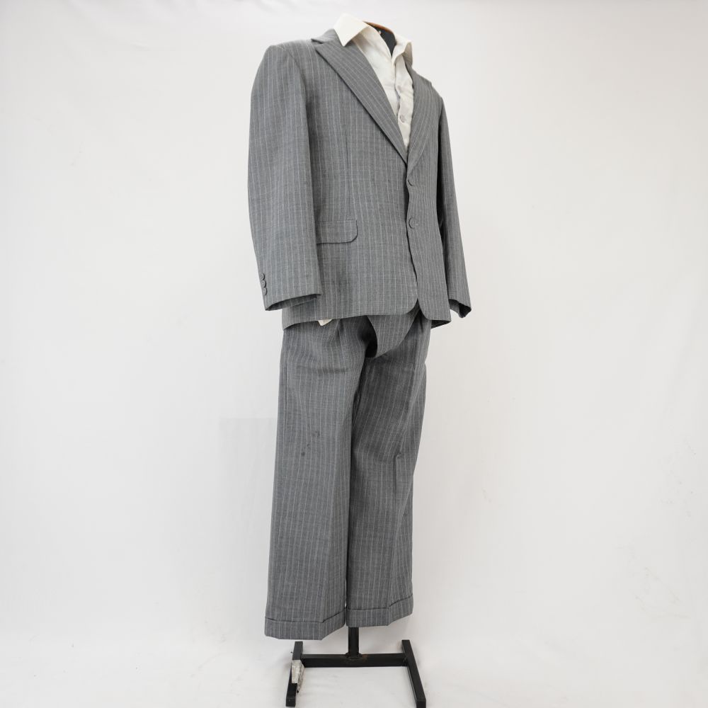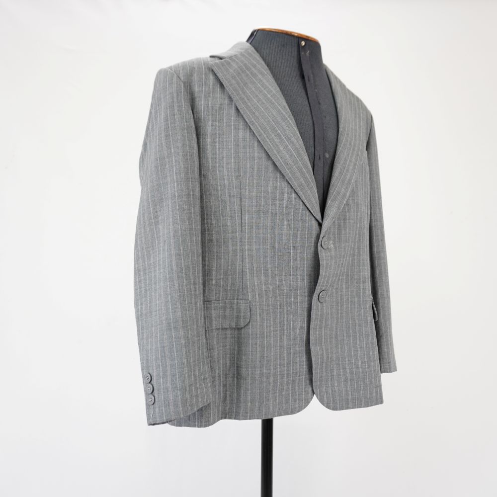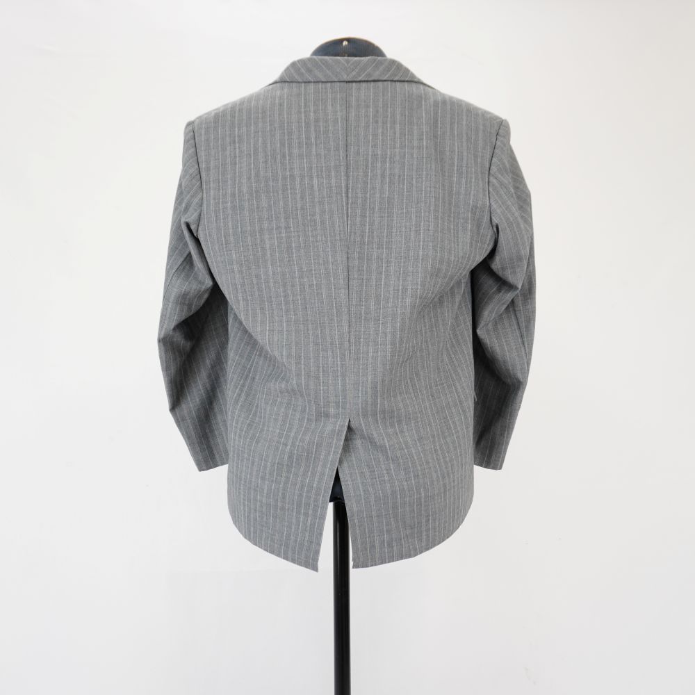 Paletó cinza com listras verticais brancas e rosa, forrado em cinza, duas abas frontais simulando bolsos e um bolso no lado esquerdo superior, três botões ornamentais em cada punho e fechamento em dois botões e fenda traseira na barra do meio das costas, com ombreira