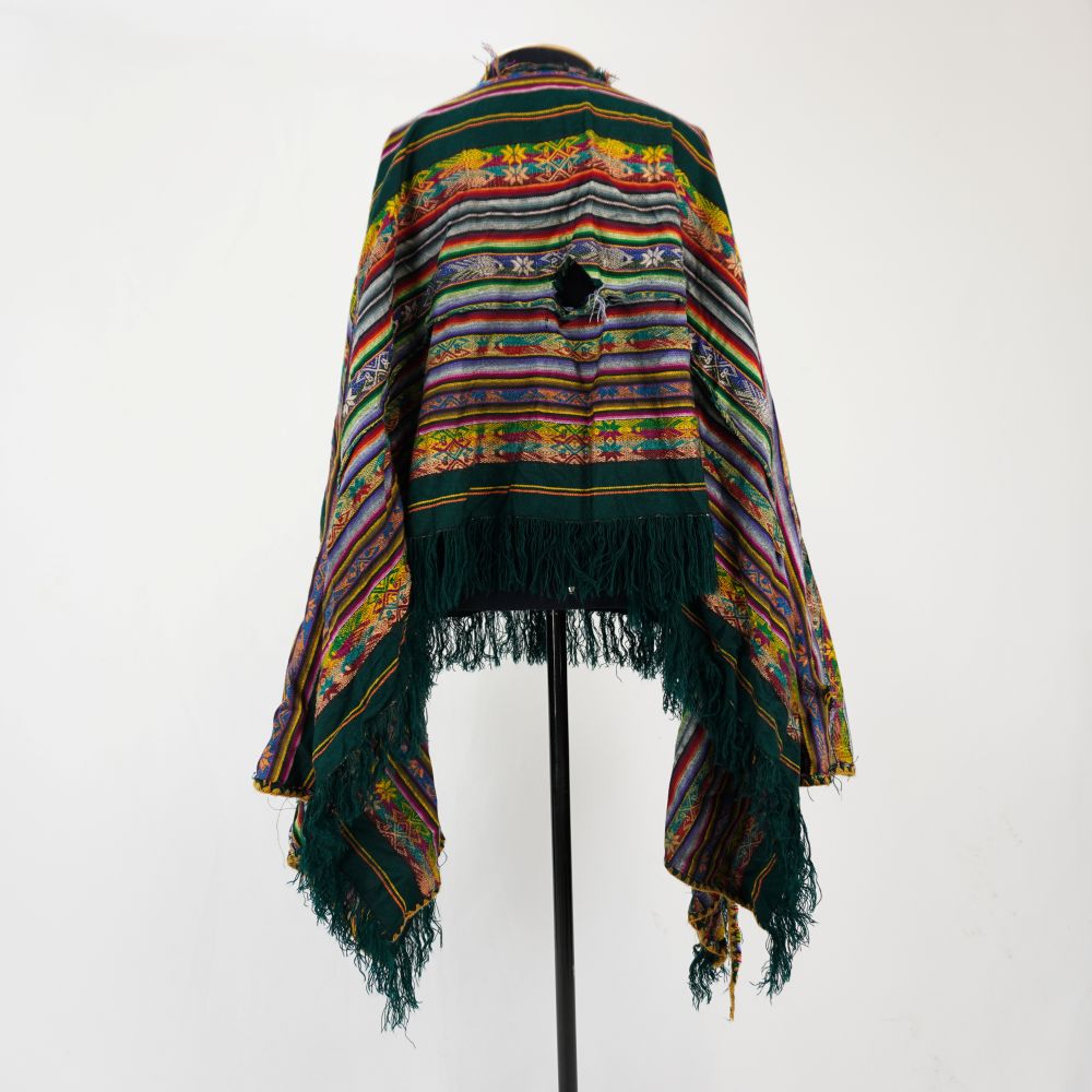 Poncho peruano com listras verticais vibrantes em diversas cores, incluindo tons de verde, amarelo, vermelho e azul, algumas listras são mais largas e contém desenhos geométricos e florais, barra bordada em verde e amarelo, barra da manga com franjas verdes e decote desfiado