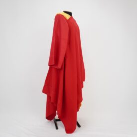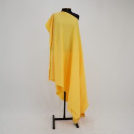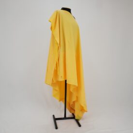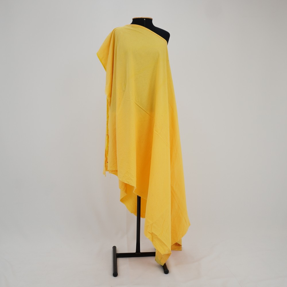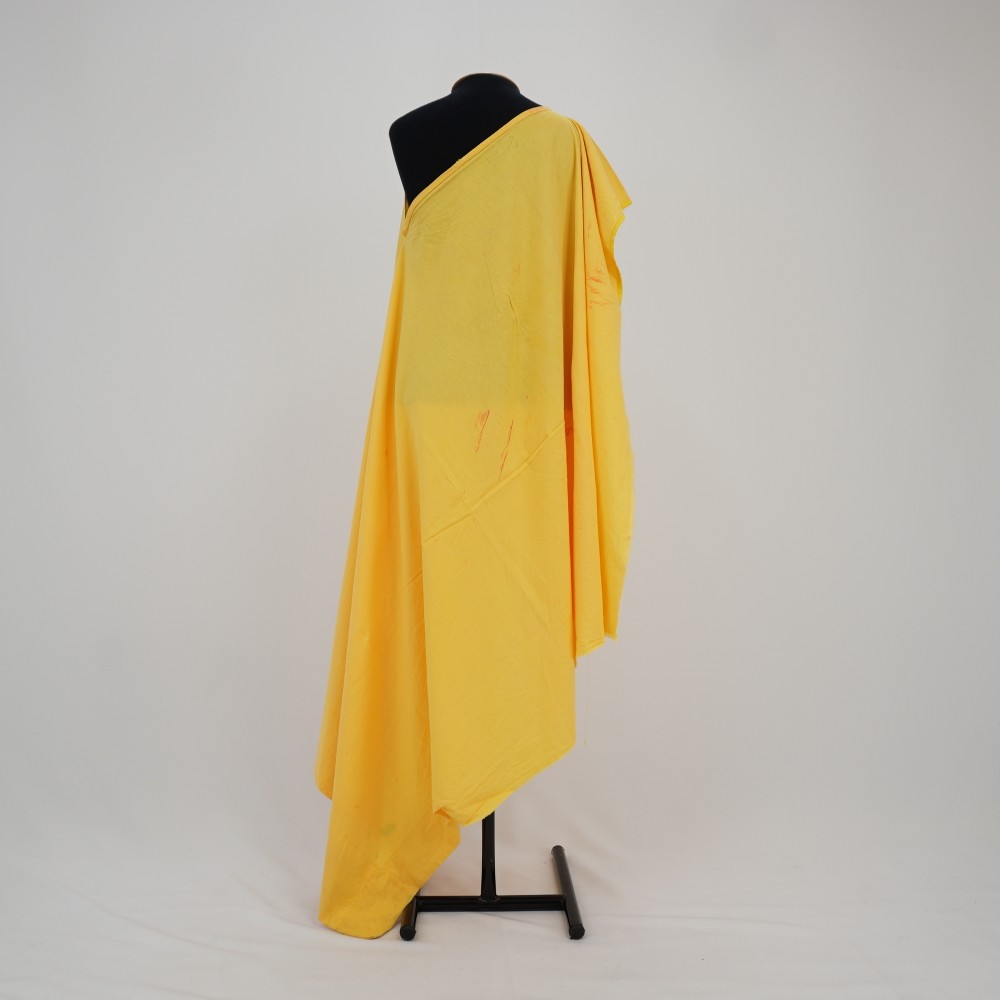 Túnica de modelagem ampla em tecido amarelo. Abertura para passagem da cabeça no meio da altura do tecido e lateralizado na largura. Barra da lateral mais próxima da abertura com aplicação de viés amarelo com sobra de viés para amarração. Restantes das barras largas de virada simples. Acabamento do decote com aplicação do viés.