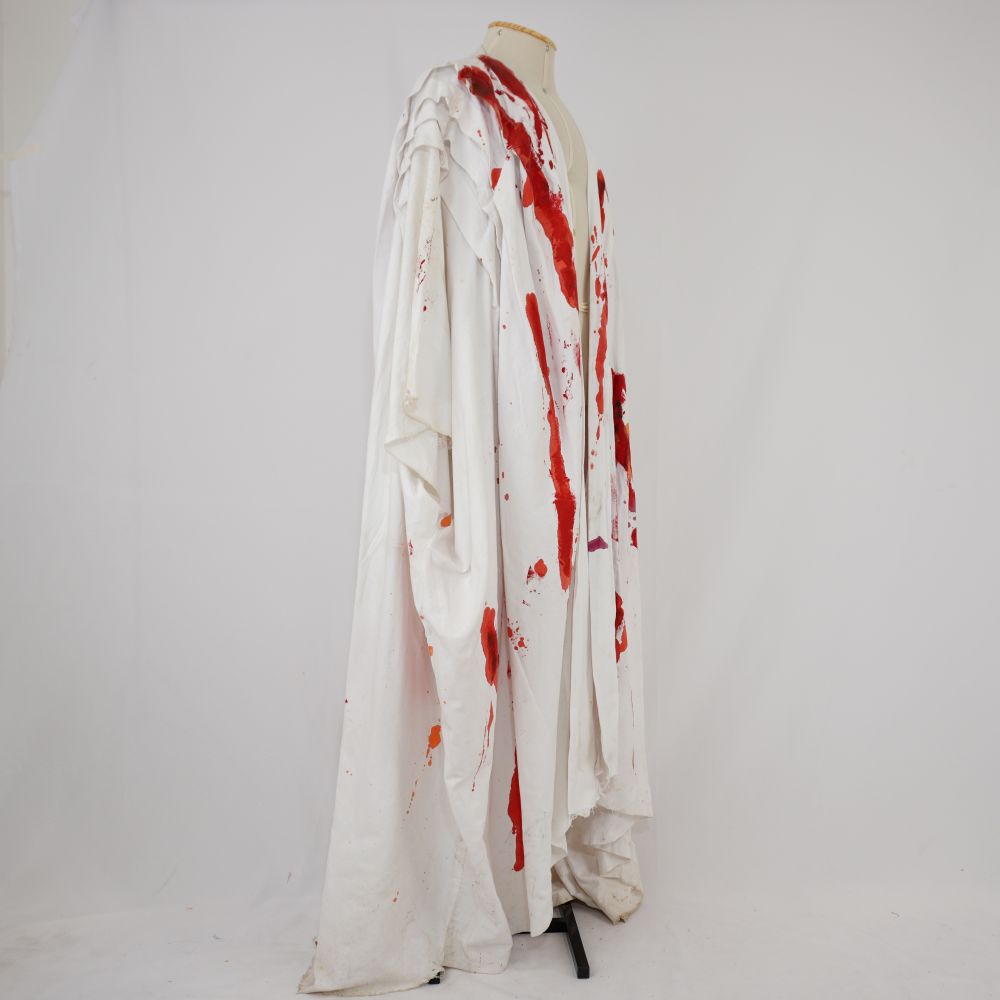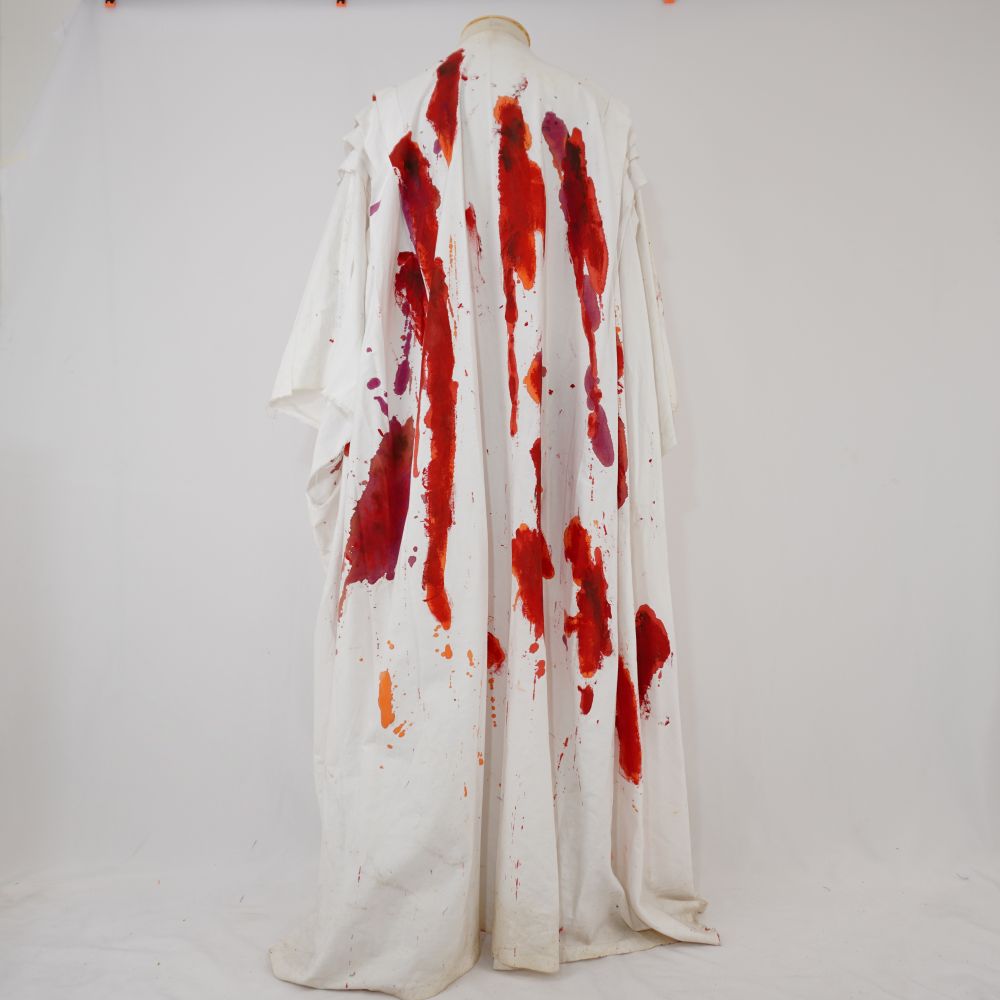 • Túnica ampla branca com pinturas em vermelho e laranja