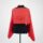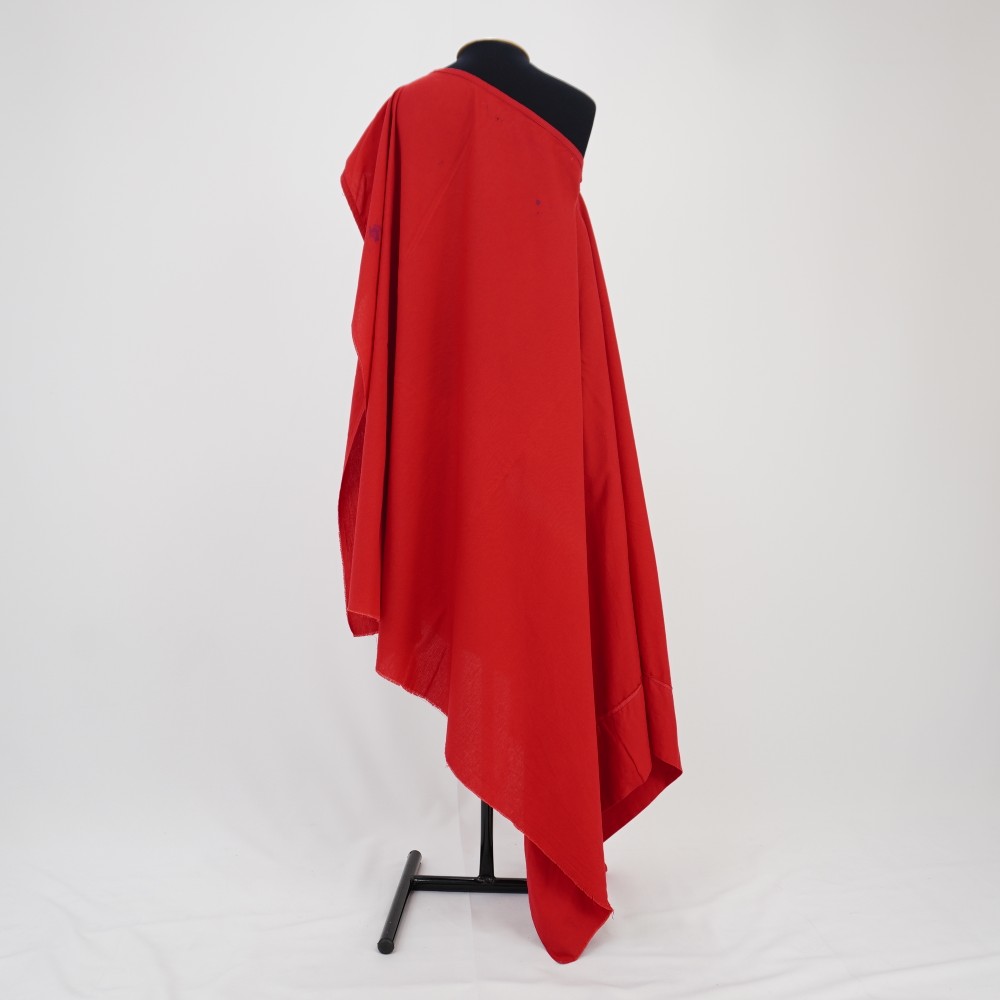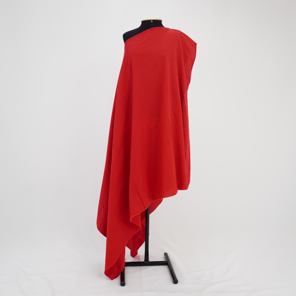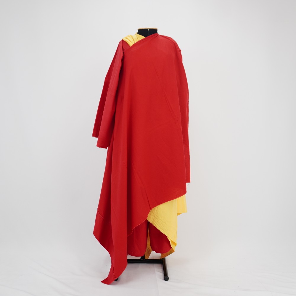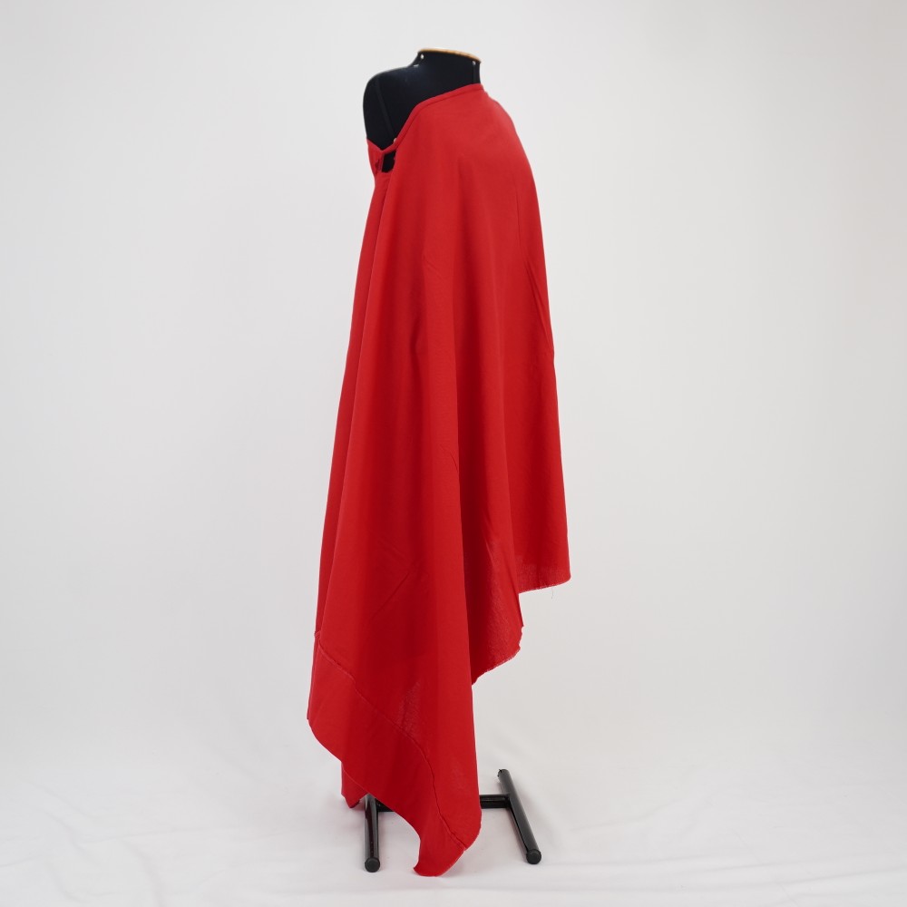 Túnica de modelagem ampla em tecido vermelho. Abertura para passagem da cabeça no meio da altura do tecido e lateralizado na largura. Barra da lateral mais próxima da abertura com aplicação de viés vermelho com sobra de viés para amarração. Barra da outra lateral larga de virada simples e barra a fio. Acabamento do decote com aplicação do viés.