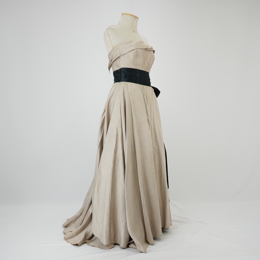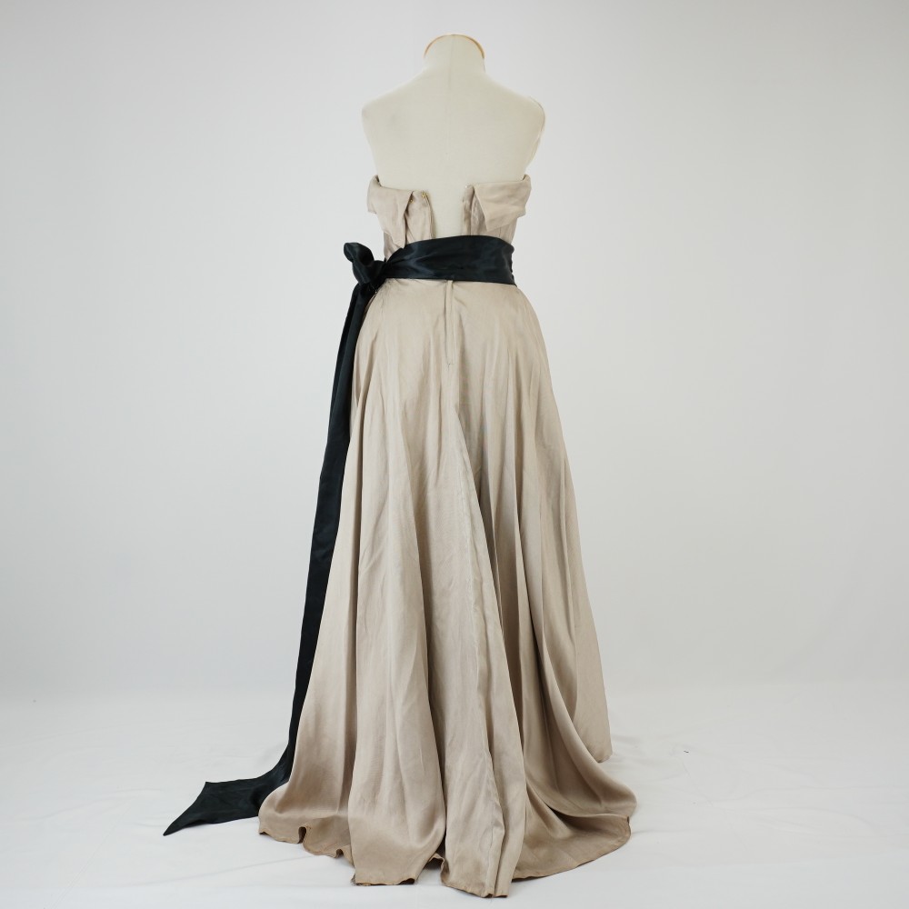 Vestido tomara que caia, bege com faixa preta na cintura, saia longa om muito volume composto com saiote de tule interno, forro e cauda longa atrás, fechamento com zíper e colchete, a pala do top tem a sobreposição do próprio tecido como um detalhe e faixa preta fazendo um grande laço atrás