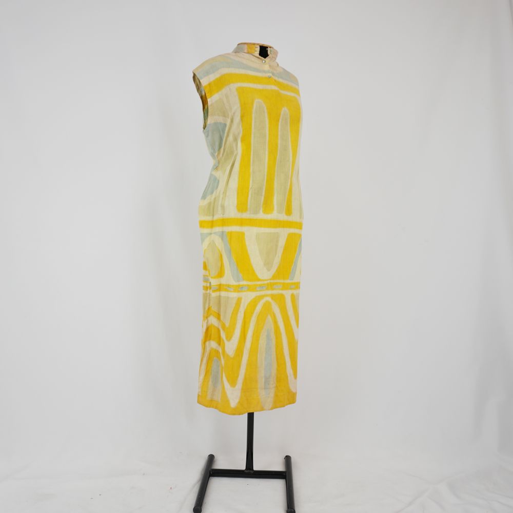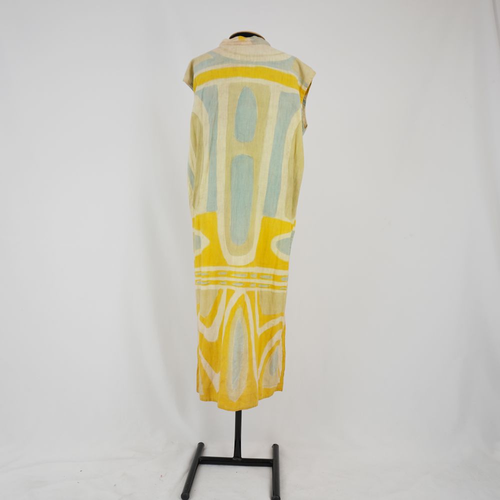 Vestido pintado a mão com base cor cru e pinturas com grafismos nas cores amarelo, azul claro e verde acinzentado pastel. Modelagem reta, sem manga, longuete com gola padre e fechamento atrás com botões de plástico de pezinho cor azul madrepérola