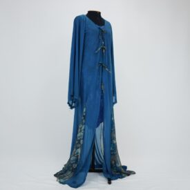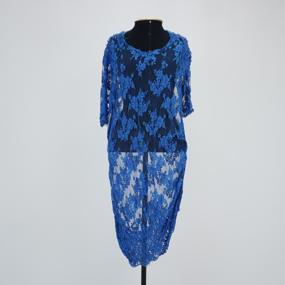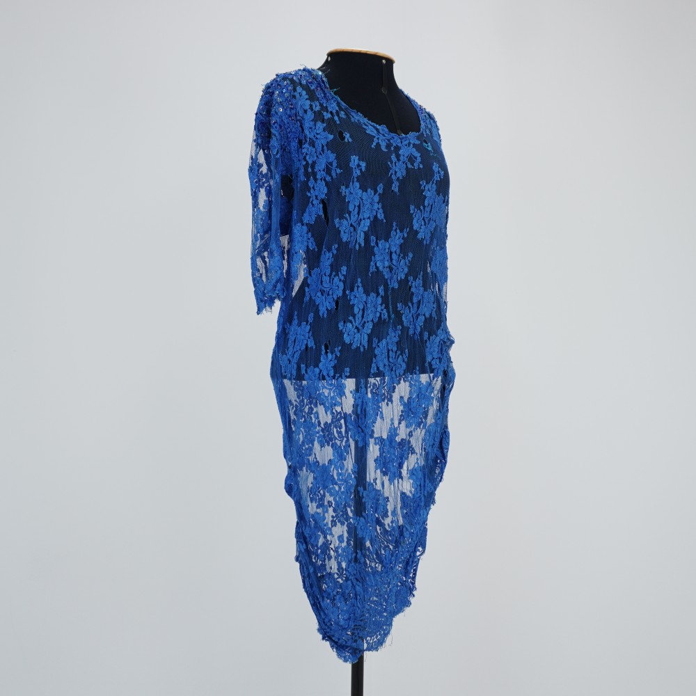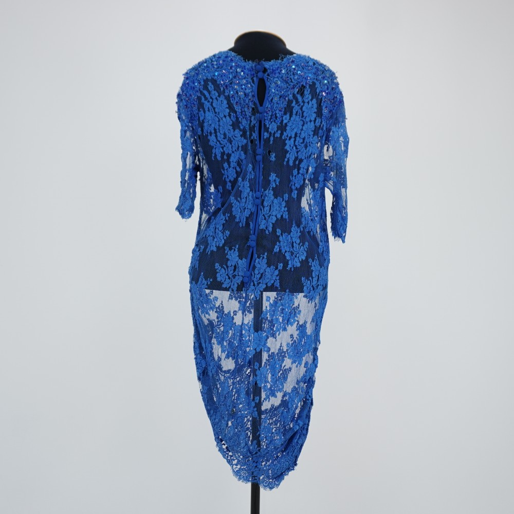 Vestido rendado azul médio, curto, manga curta, laterais próximo a barra franzidas, costas com abertura em viés e fechamento em seis duplas de botões de pé forrados, com colchete, ombro bordado com miçangas, paetê, lantejoula e vidrilho em tons de azul e prata