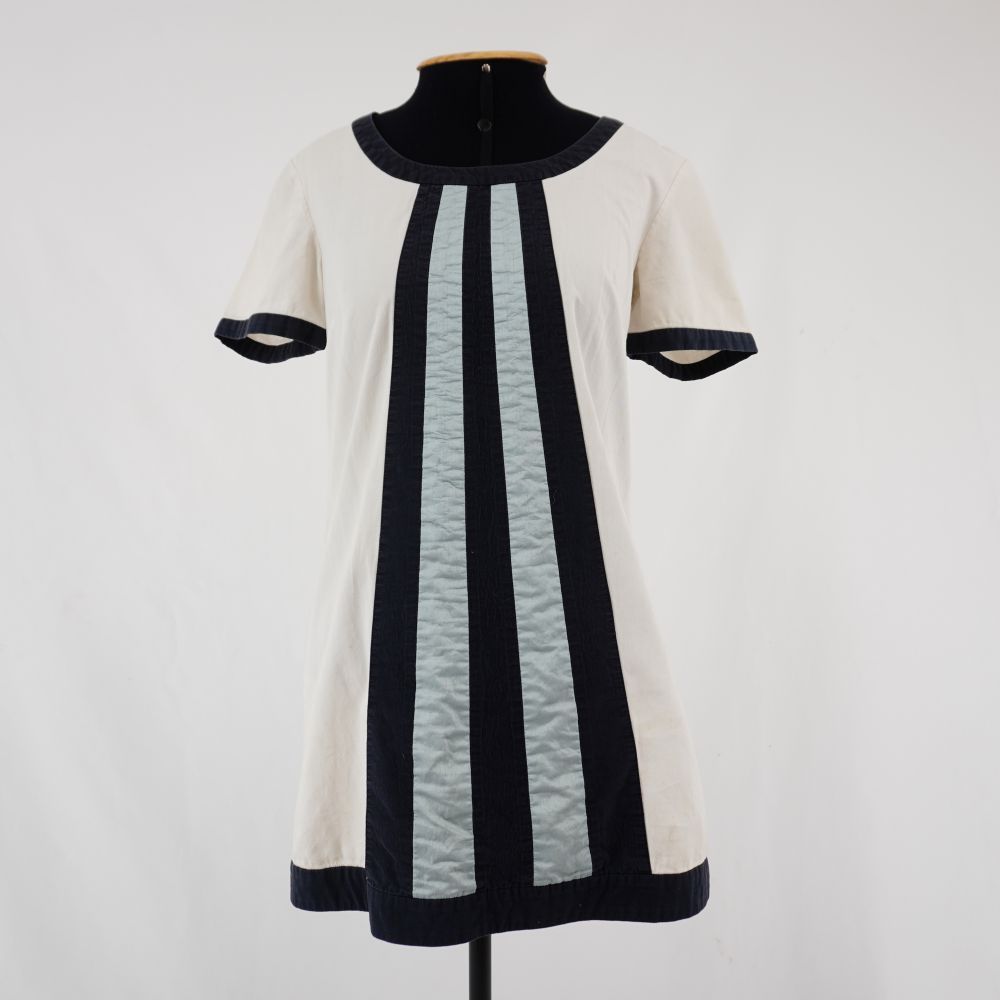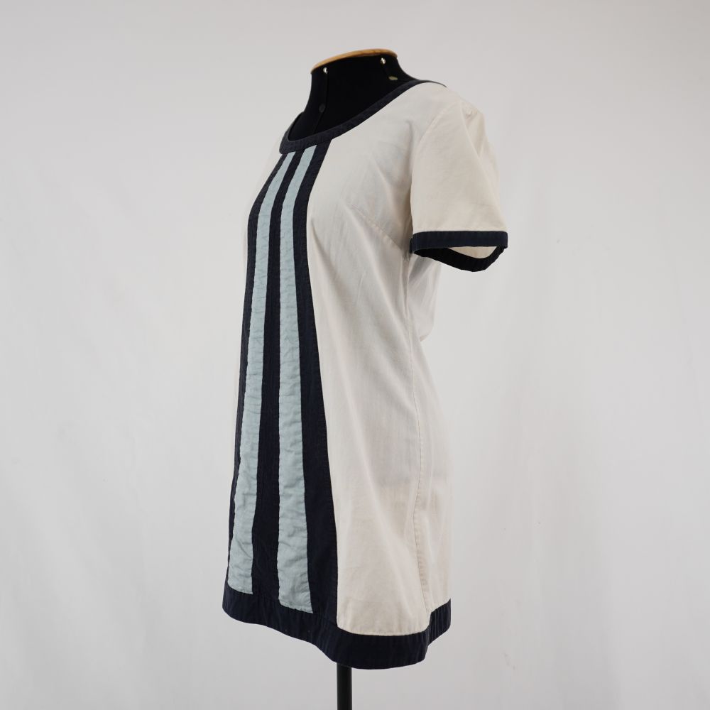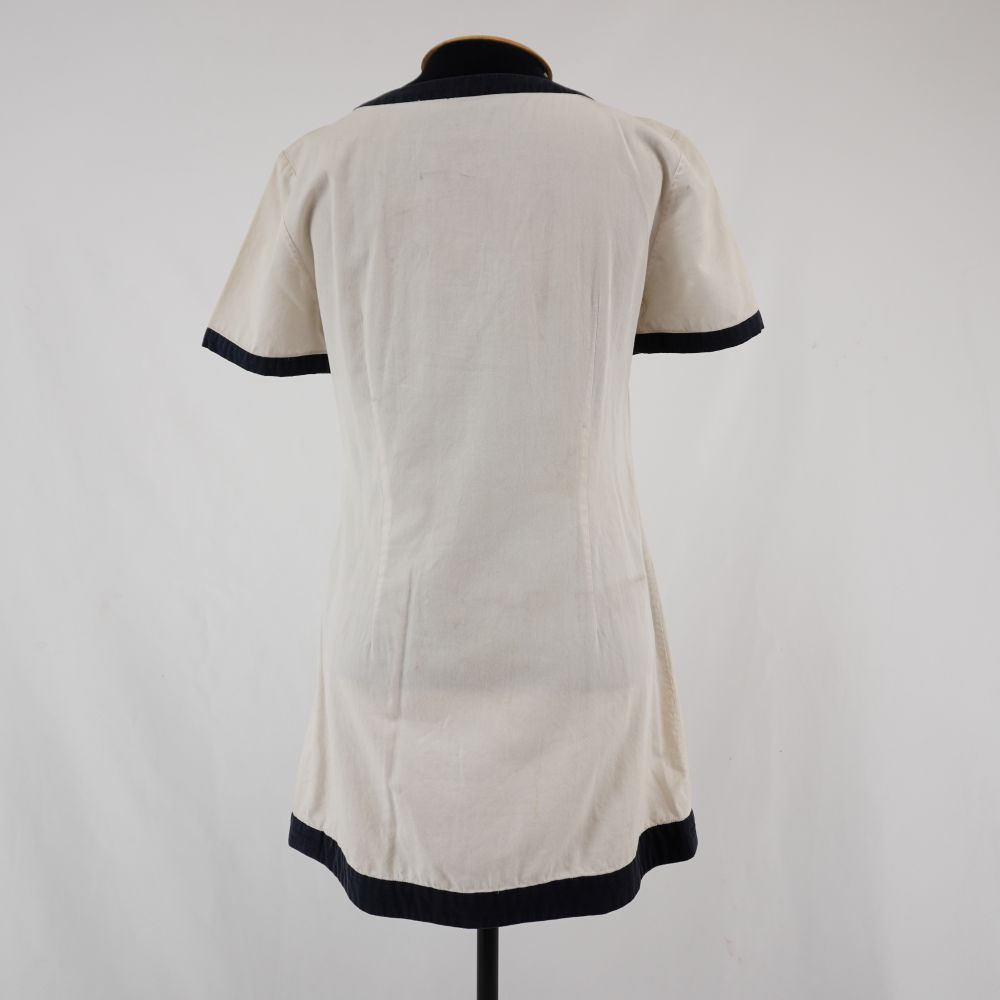 Vestido curto trapézio Voltar U.CS.01.070 (1) U.CS.01.070 (2) U.CS.01.070 (3) Metadados Miniatura Compartilhe Número de TomboU.CS.01.070TítuloVestido curto trapézioDescriçãoVestido curto reto branco com mangas, decote e barra em viés azul marinho. Recorte frontal em forma de trapézio intercalando listras azul marinho e azul claro.LocalizaçãoSala 003EspetáculoCacildasColeçãoColeção RepertórioDimensões do Item - altura x largura (cm)79 x 64Material/Composição do ItemTecido plano sarjado e tecido plano acetinado.Estado de ConservaçãoBomData da Catalogaçãonovembro 25, 2025 Continuar navegando Vestido listrado Blusa azul royal Voltar para a lista de itens