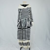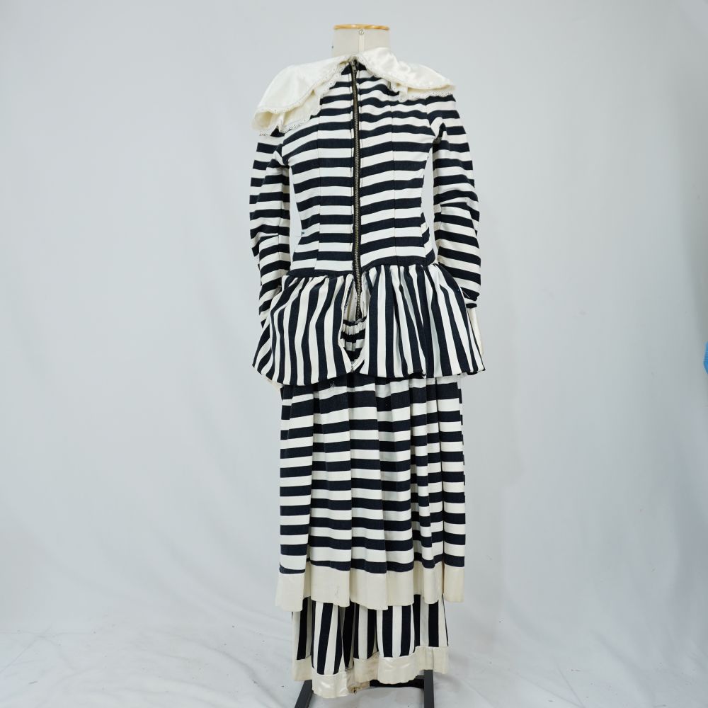 Vestido listrado preto e branco de manga longa e gola branca larga com rendas. Sobreposição de duas saias, uma balonê curta, a outra a baixo do joelho e calça por baixo. Alternando o horizontal e vertical das listras e com fechamento de zíper