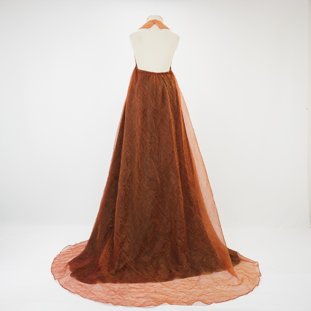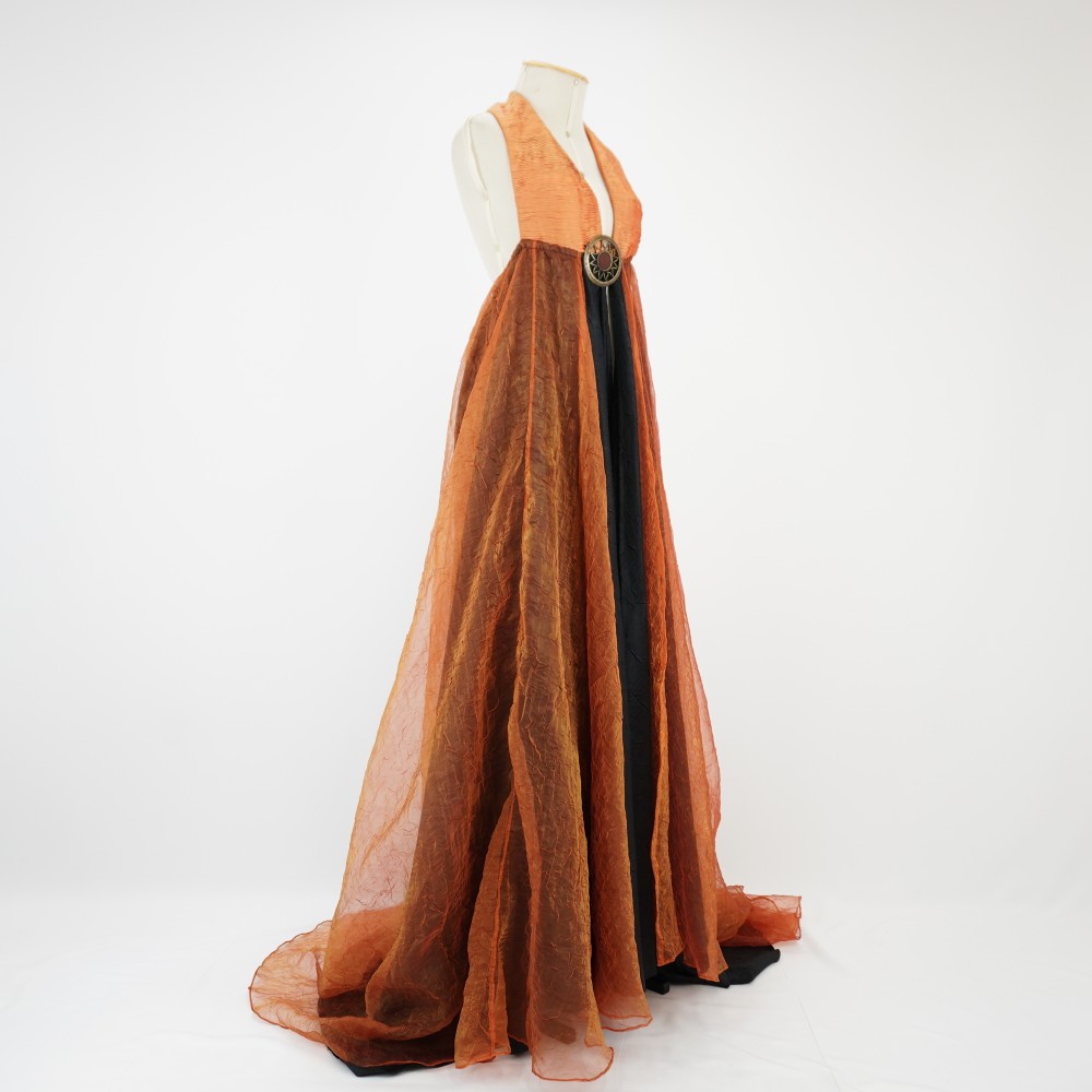 Vestido longo com cauda, busto laranja texturizada drapeado frente único, saia dupla com camada em tecido preto e laranja com transparência, fechamento no centro frente na cintura com colchete de gancho e fivela redonda de sol fixada a cima em latão ouro velho e centro laranja