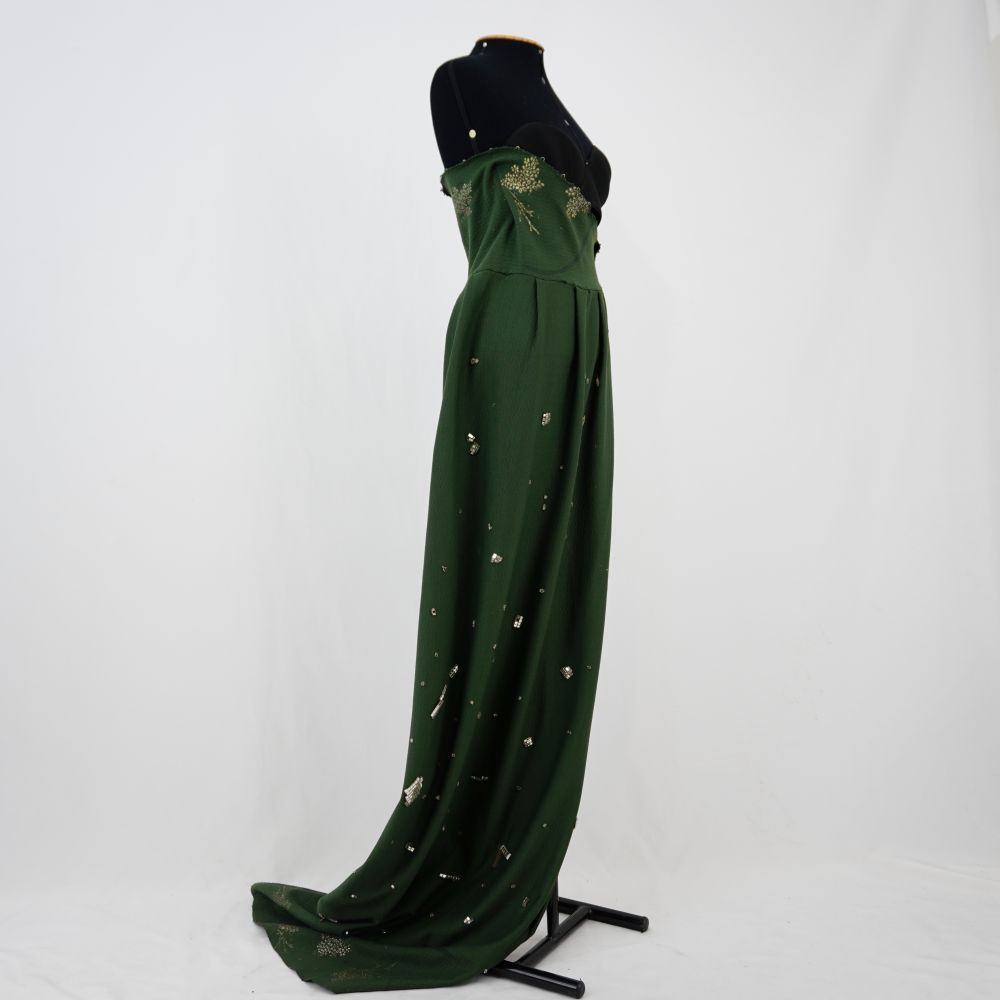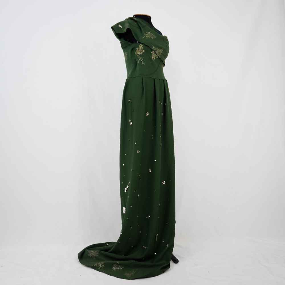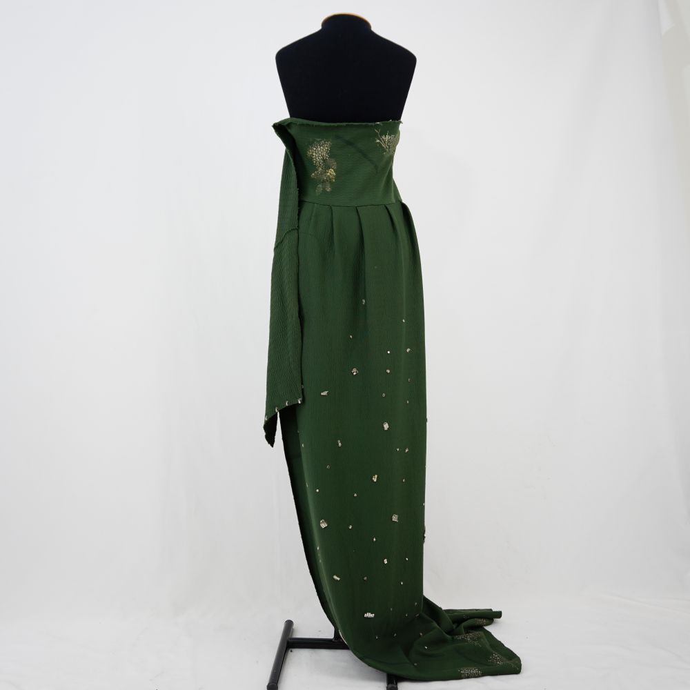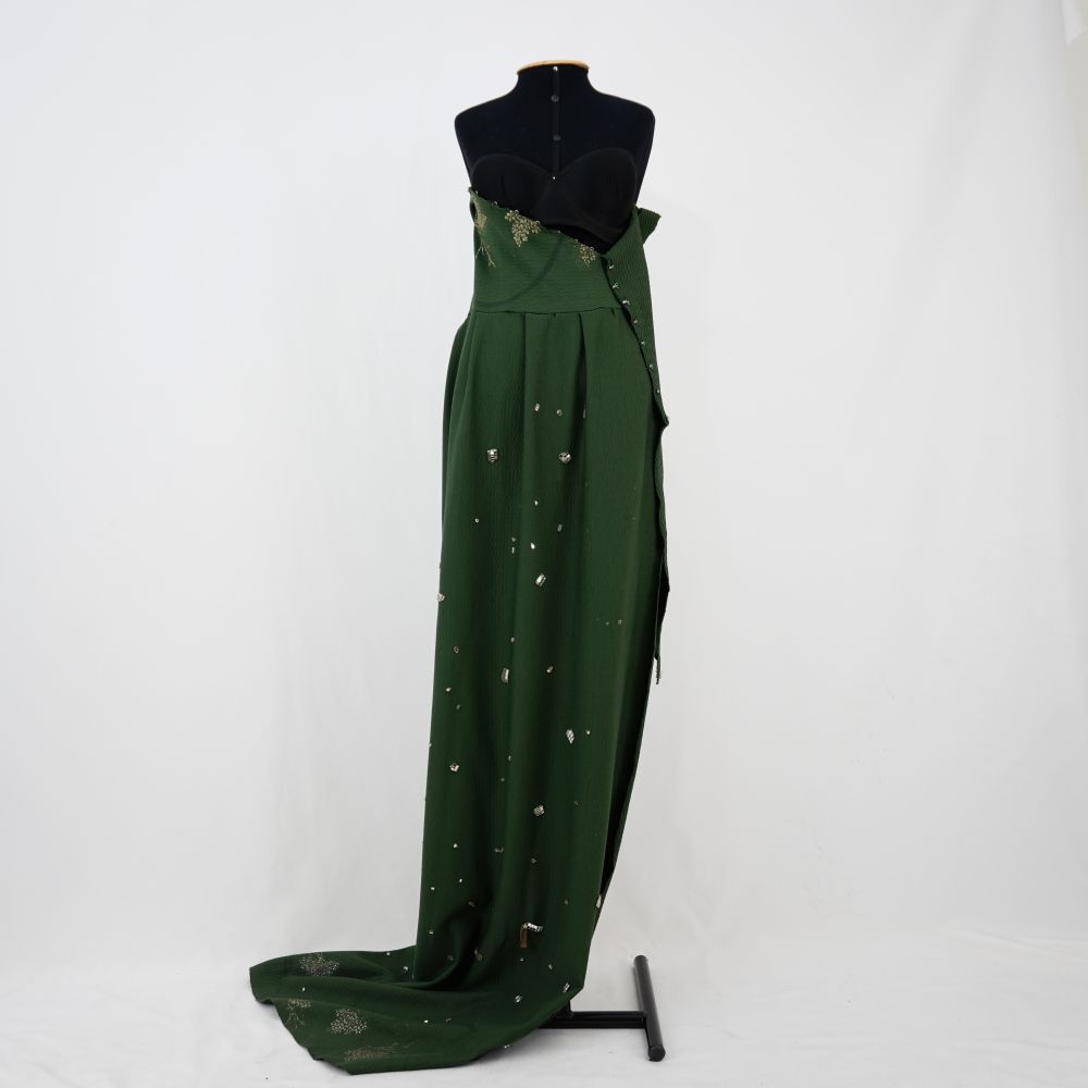 Vestido longo verde de tecido texturizado, um ombro só e bojo embutido. Aplicação de aviamento espelhado por toda a peça e pintura dourada/prateada e preta na parte superior do vestido. Parte superior do vestido é dividida em dois, sendo a inferior fixa na saia e a superior unida com colchetes de gancho metálico. Pregas na cintura da saia.