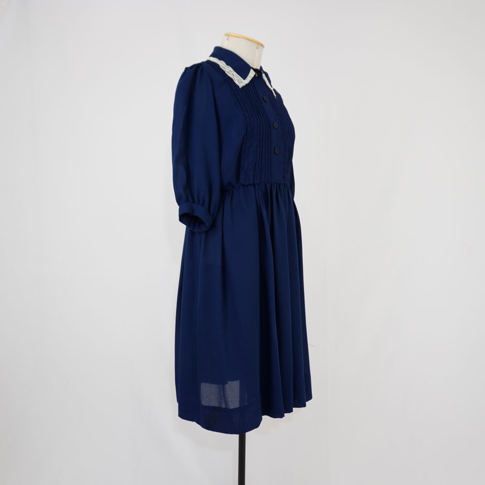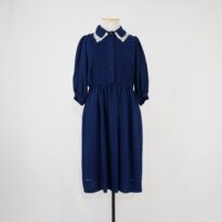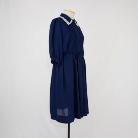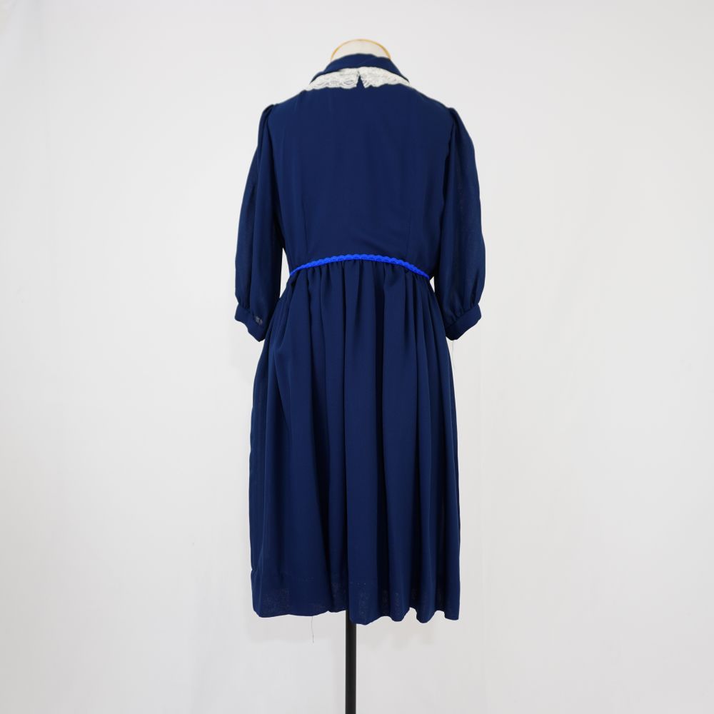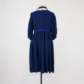 Vestido midi com manga curta azul marinho, parte superior com nervuras e saia franzida, gola com aplicações de renda branca, manga bufante e fechamento frontal com botão de plástico preto e zíper invisível na lateral, renda azul na cintura traseira, forro longo