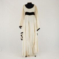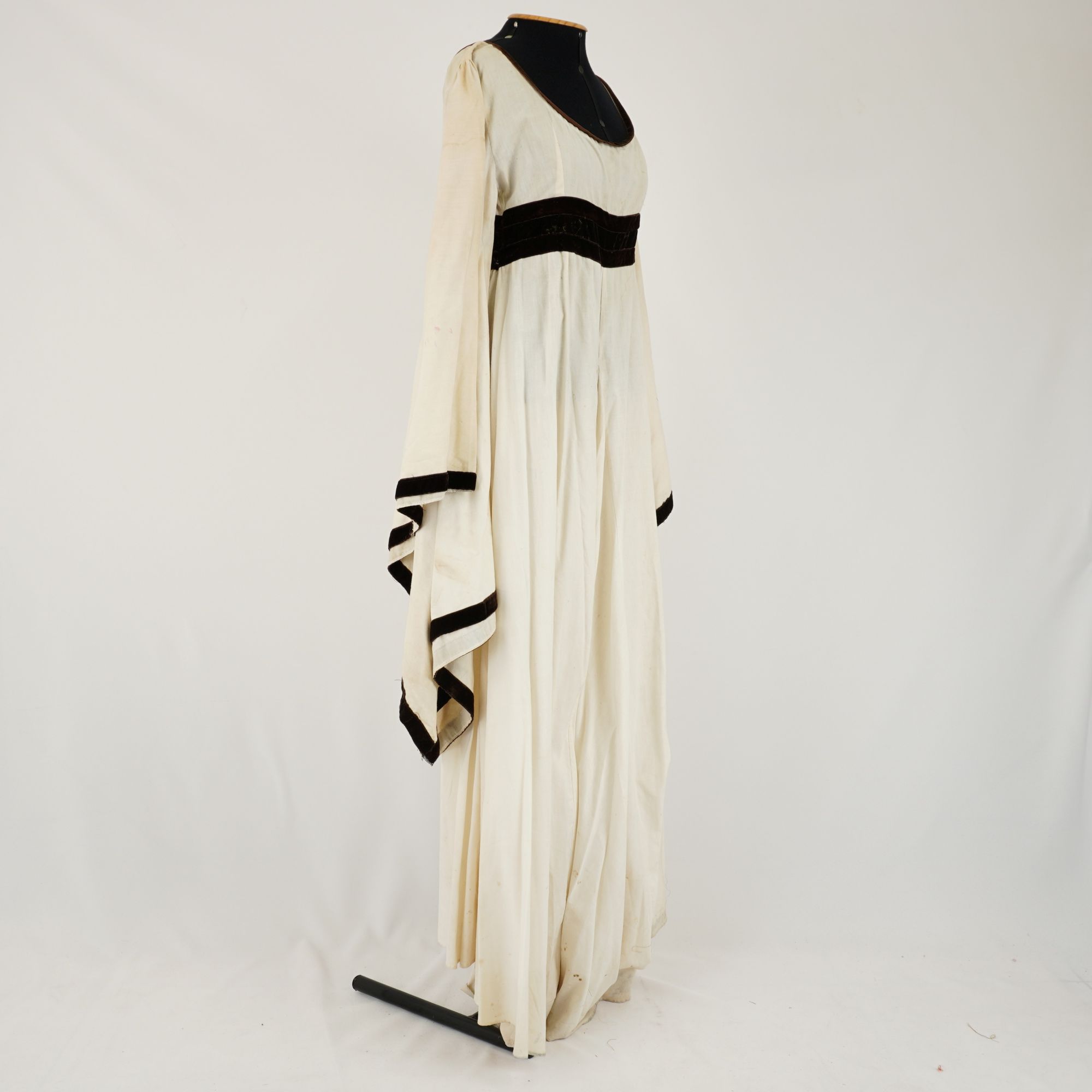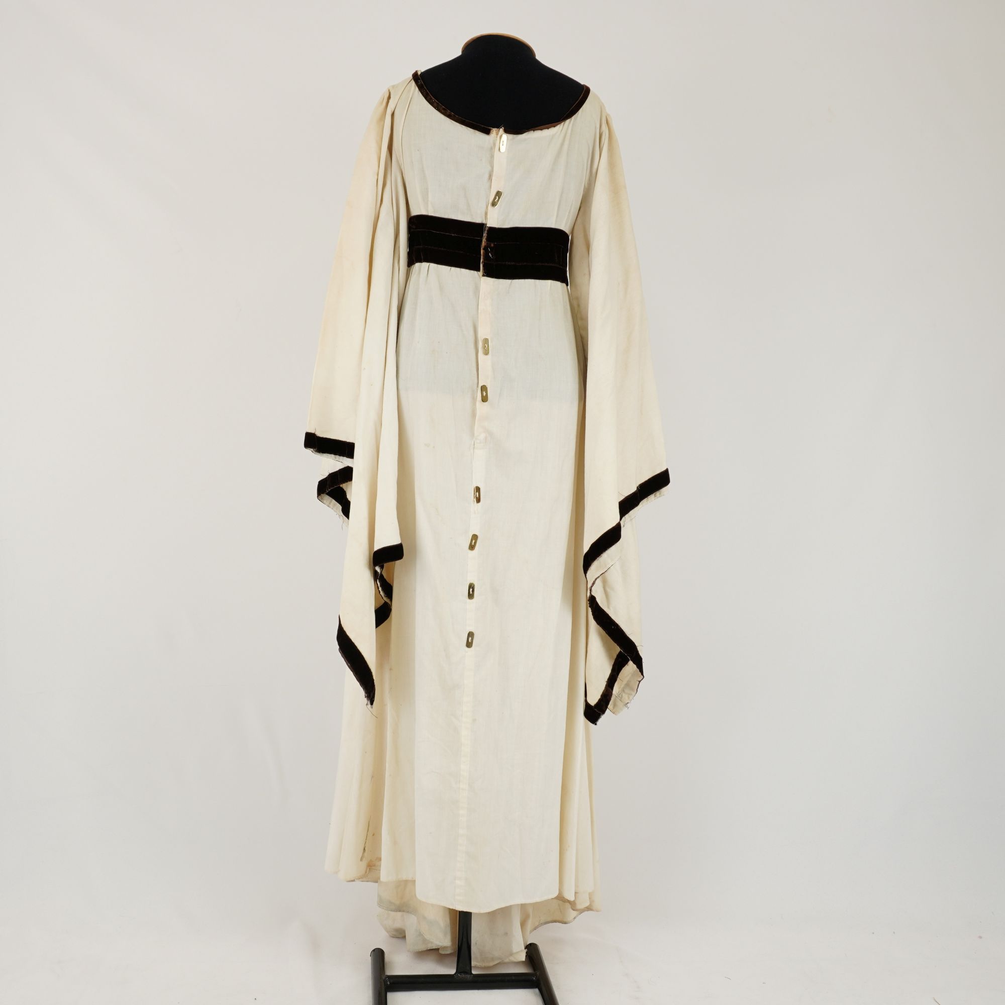 Vestido longo com cauda off white, com manga pendende, decote arredondado, aplicação em fita de veludo marrom no decote, cintura e punhos, aplicação em botões dourados em metal na frente e velcro no fechamento