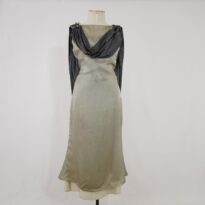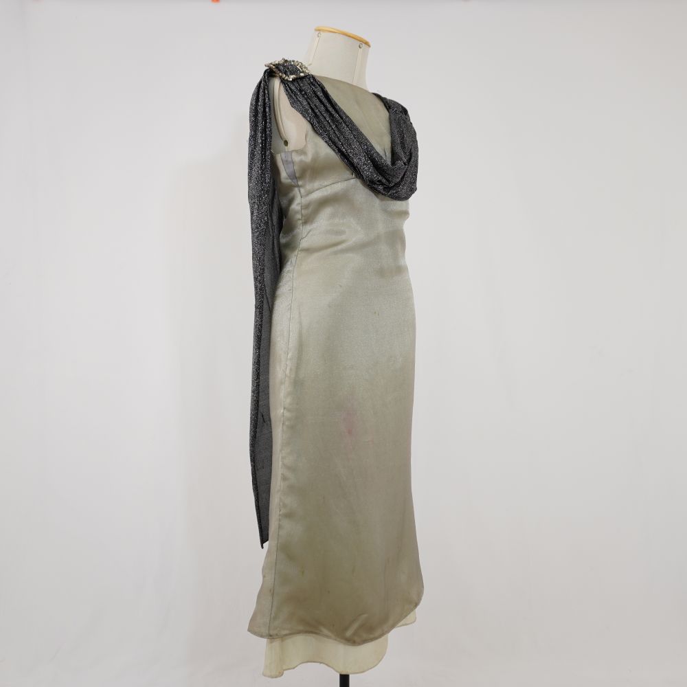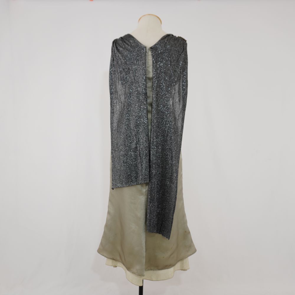 Vestido midi sem mangas com forro em cetim gelo e vestido em organza com brilho prateado, duas pregas de cada lado do busto para cintura. Faixa de lurex preto costurada nos ombros e pendente nas costas como capa, com fivela de metal e pedraria no ombro direito. Fechamento em zÃper no meio das costas