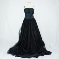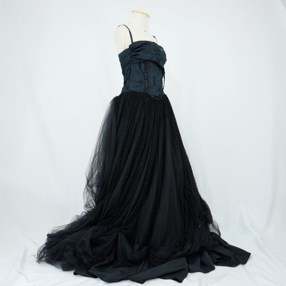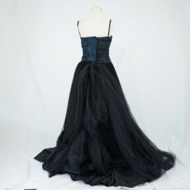 Vestido preto sem alça de tecido preto com flores em jacquard, forro com barbatanas. Na parte da frente detalhe de passamanaria preta com gancho. Saia volumosa godê de quatro camadas, por cima tule de bolinha preta, detalhes presos com alfinetes. Camada de baixo de tule